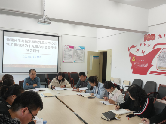 为进一步深入学习贯彻党的十九届六中全会精神,物理科学与技术学院党总支于12月23日下午在新逸夫楼327召开党的十九届六中全会精神中心组学习研讨。党总支书记李慧龙主持本次研讨,第三督导组联络员张少峰及学院中心组全体成员参加了本次学习研讨。