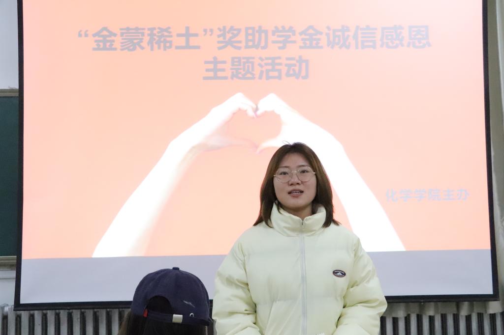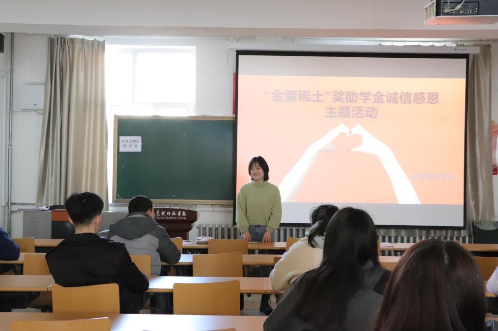 包头市著名企业家、包头市金蒙稀土有限责任公司董事、金蒙汇磁材料有限责任公司董事长孙喜平先生,十六年厚德育人、回馈社会,坚持无私资助我校数百名家庭困难学生,帮助他们顺利完成学业。为了由衷地感谢孙喜平先生和企业的善举,传承扶贫济困、无私奉献的中华美德,12月21日,校资助管理科主办,化学学院学工办承办了“金蒙稀土”奖助学金感恩活动。全校获得“金蒙稀土”奖助学金的同学参加了此次活动,活动由院学工办杨茹老师主持。