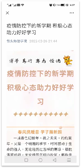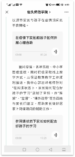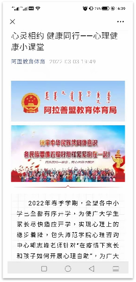 同时,校心理咨询中心发挥自治区心理健康教育与咨询工作示范中心的作用,积极与我校引领、示范、辐射、带动的3所兄弟院校和对口支援的阿拉善盟取得联系,给予帮助和指导。中心郭志峰老师还特别录制了“在疫情下家长和孩子如何开展心理自助”和“在网课状态下,家长如何配合好孩子的学习”两段音频,为广大居家学习学生和家长支招。