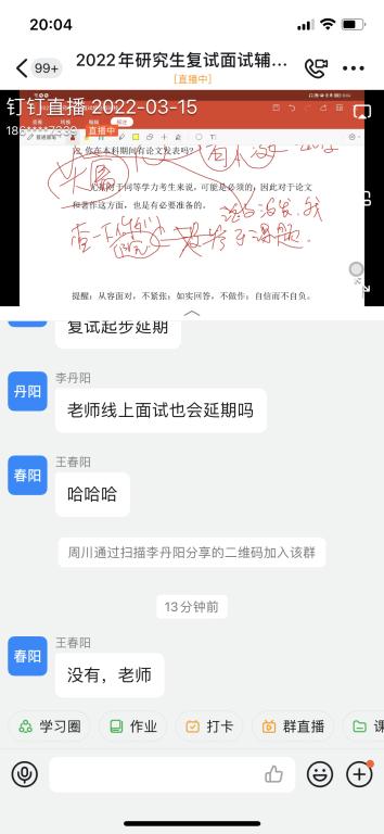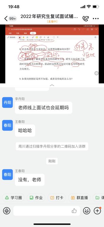 曹志涛老师通过钉钉直播,就考研面试的政策、流程、如何备考、调剂等学生关心的问题进行了有针对性的讲解。讲座结束后,曹老师与学生积极互动,解答学生关于面试、调剂中诸多细节提问,同时提醒学生提早了解报考院系导师的研究方向,勉励同学们如实作答、从容面对,自信而不自负。(数学科学学院)