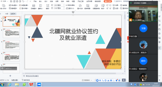 疫情防控期间,为做好2022届毕业生就业工作,3月17日下午,音乐学院通过腾讯会议平台开展“北疆就业网协议签约及派遣”线上讲解,助力学生求职战“疫”。学院书记赵玉强、副书记贾晓光、各毕业班班主任及全体学生参加讲座。
