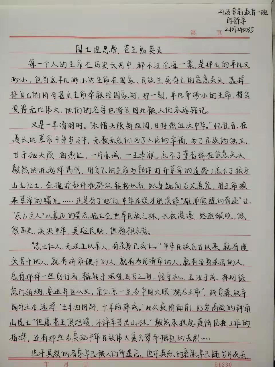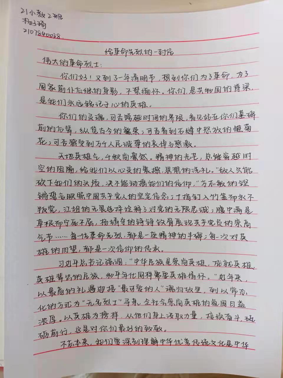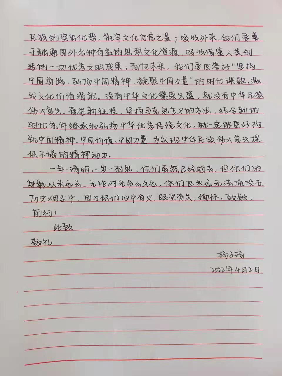 4月2日-4月3日,学院学生第二党支部举办了“缅怀革命先烈,弘扬民族精神”征文活动。活动以书信的形式,围绕“大学生如何继承和弘扬先烈精神”、“想对革命先烈说的一些话”展开,并设计一个信封。活动期间,参与人员满怀着对革命先烈的崇高敬意了解了先烈们的英勇事迹,回顾了当年的峥嵘岁月,体会了先烈们的爱国情怀。同学们的作品里有英勇无畏的黄花岗七十二烈士,面对敌人的铡刀也不肯屈服的刘胡兰、严刑拷打也不改变信仰的江姐、牺牲自己保护战友的黄继光,一个个抛头颅洒热血的英雄故事血泪交融,振奋人心。同学们在字里行间抚今追昔,饮水思源,抒发了对革命先烈的深切怀念和崇高敬意。
