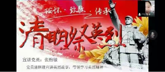 党的十八大以来,习近平总书记缅怀英烈的足迹遍布祖国大江南北。每一次庄重的鞠躬,每一次深情的凝望都寄托了他对革命先烈和人民英雄的深切缅怀与致敬。为深化主题教育实践活动,引导广大青年大学生自觉做弘扬爱国主义的时代先锋,传承革命传统和优良作风。4月2日,经济与管理学院于线上开展以“传承红色基因,缅怀革命先烈”为主题的宣讲活动。2018级会计isec班、2020级公共事业管理班、2021级普通会计学班参加本次活动。特别邀请学生党员张煦敏、初明阳主讲。