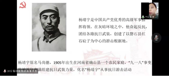 学生党员张熙敏就革命先烈杨靖宇的故事为我们宣传红色革命精神。她强调在百年未有之大变局中,我们要继承共产党人的风骨、气节、操守、胆魄,为中国梦的实现不断奋斗。我们要缅怀革命先烈,赓续红色精神,积极作为,回报先烈,激励未来!