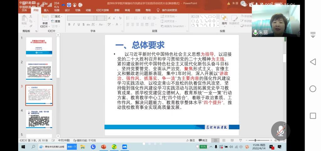 4月14日下午,数学科学学院党总支召开强化作风建设学习实践活动动员大会,会议由党总支书记朱丽主持,学院全体党员参加会议,会议以腾讯视频会议的方式进行。