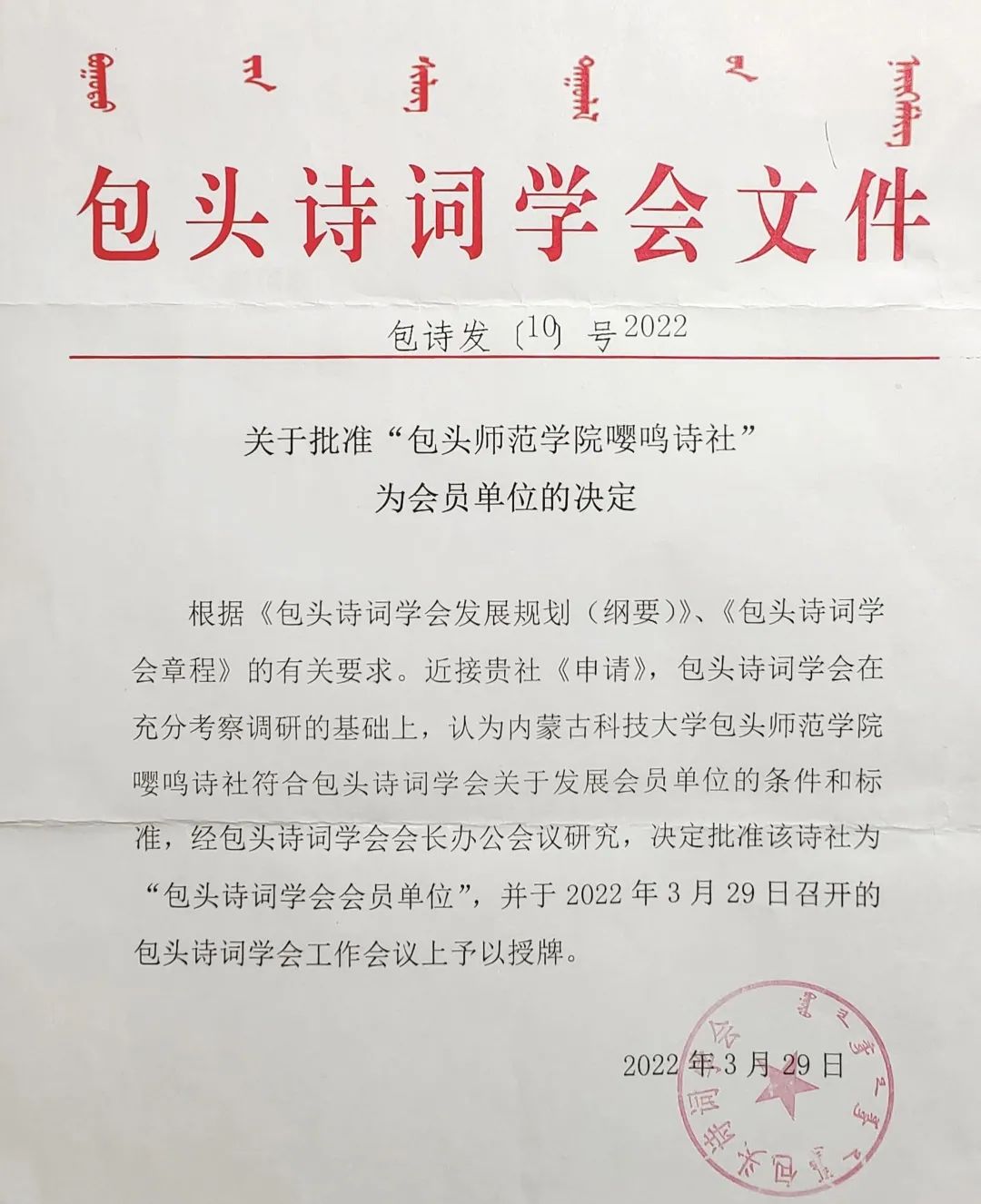 按照包头市委宣传部对文化艺术工作的总体部署和要求,在包头市委老干局、包头市文联的指导和支持下,根据《包头诗词学会发展规划(纲要)》、《包头诗词学会章程》的有关文件要求,嘤鸣诗社积极认真地准备材料,在包头诗词学会充分考察调研的基础上,认为嘤鸣诗社符合包头诗词学会关于发展会员单位的条件和标准。经包头诗词学会会长办公会议研究,决定正式批准我校为“包头诗词学会会员单位”。