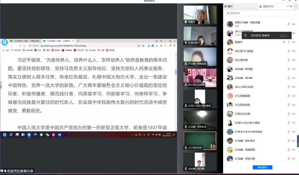 近日,习近平总书记在中国人民大学考察时发表重要讲话在广大青年中引发热烈反响。经济与管理学院团总支于4月28日晚7时在线上开展“喜迎二十大、永远跟党走、奋进新征程——学习习近平总书记在中国人民大学考察时重要讲话”主题团课。由学工办主任陈丽芳老师主持,2019、2020级团员参与。