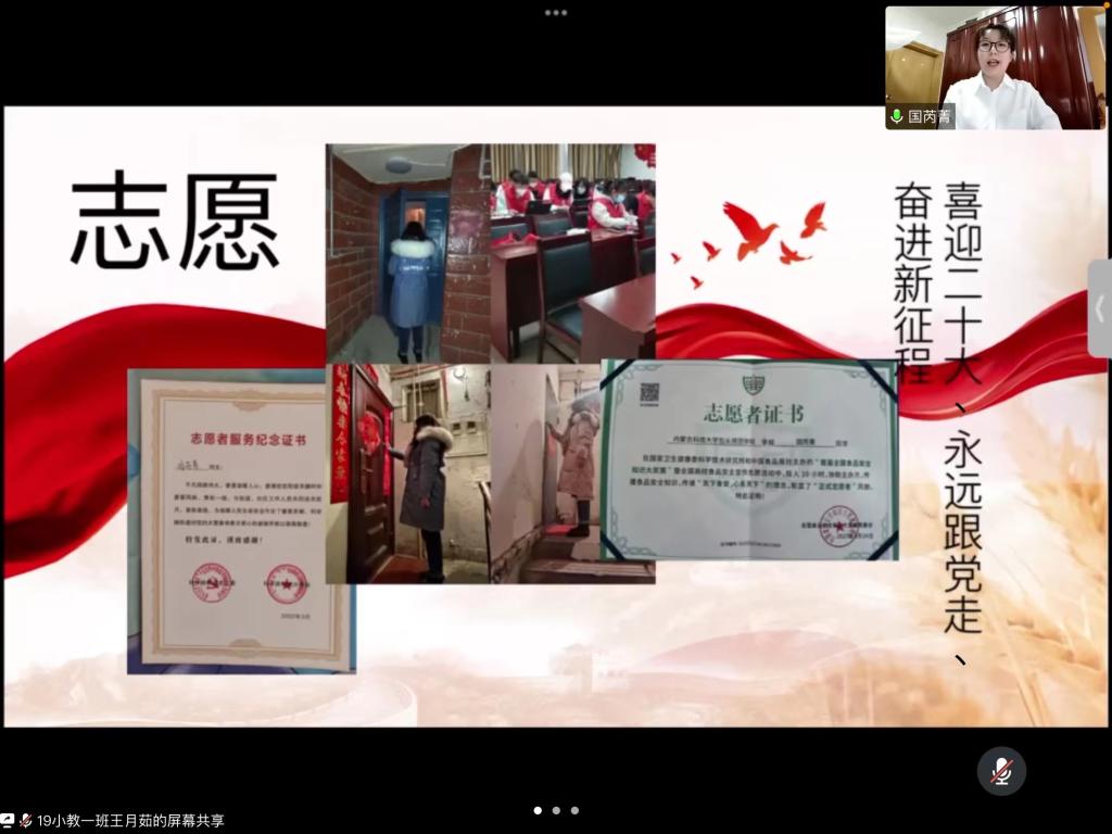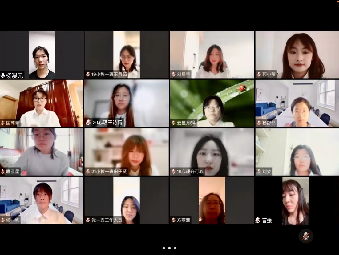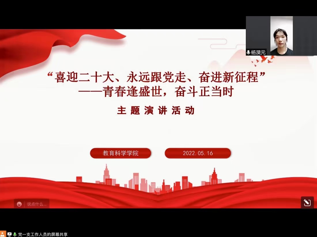 为了深入学习贯彻习近平总书记在庆祝中国共产主义青年团成立100周年大会上的讲话,教育引导青年学生自觉树立和践行社会主义核心价值观,加强思想道德修养,弘扬爱国主义精神,坚定理想信念,教育科学学院学生党支部于5月13日-16日在腾讯会议上举办“喜迎二十大、永远跟党走、奋进新征程”——青春逢盛世,奋斗正当时主题演讲活动。本次活动共有15人参加,学工办主任方丽慧老师和辅导员曹媛老师出席活动,三名学生干部担任活动评委。