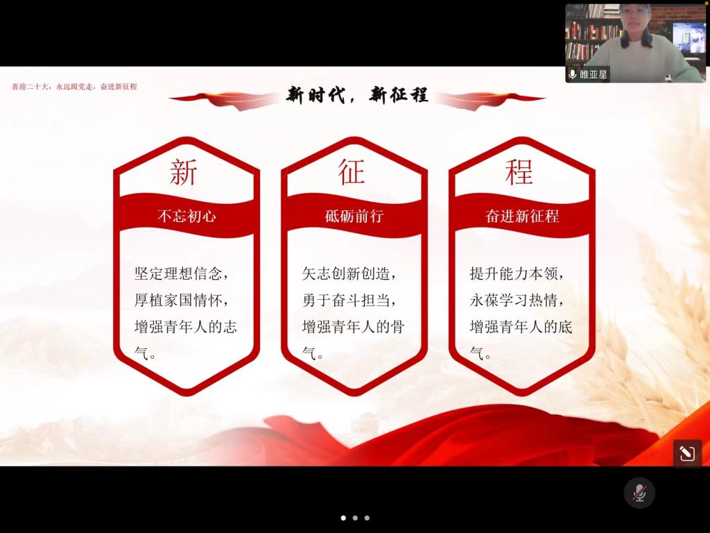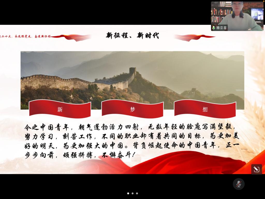 学生们的演讲内容严谨充实、语言清晰流畅、主次分明,不仅分享了对习近平总书记在中国共产主义青年团成立100周年大会上讲话的心得与深刻感想,还表达了青年一代如何践行青春使命、如何担当中华民族伟大复兴的历史重任的认识和决心。同时,大家结合自身专业的情况,表明了要立大志、明大德,自觉树立刻苦钻研,爱岗敬业的信念,以热情饱满、昂扬向上的姿态面对未来美好生活。有的同学表示,作为青年大学生,要深刻把握讲话的丰富内涵和精神实质,把思想和行动统一到中央对青年一代的希望和要求上来,勇于开拓创新,崇尚实干实学;还有的学生们庄重承诺,要坚定理想信念,不断超越自我,并发出“请党放心,强国有我”的承诺。活动的最后,学工办主任方丽慧老师对本次活动进行点评,表扬了同学们虽是在线上进行活动,但依然准备充分,强调同学们应秉承先辈们的精神,展现出新时代中国青年的精神风貌,学好本领,为祖国的发展贡献出自己的力量,也祝福祖国越来越美好。