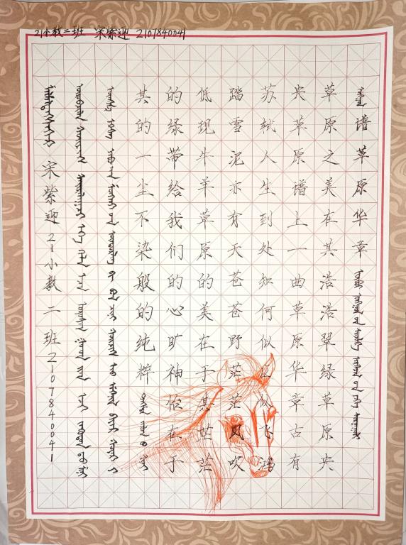 大风泱泱,大潮滂滂,春华秋实七十余载,守望相助谱绘新篇。2022年是内蒙古自治区成立75周年,为贯彻落实党的教育方针和民族政策,进一步深化新时代高校民族团结进步教育,铸牢中华民族共同体意识,教育科学学院大学生社团联合会和教师职业技能发展部于4月19日至5月15日联合举办“亮丽北疆奏华章,同心共筑中国梦”一院一品主题作品展活动,活动由辅导员王璐然策划指导。