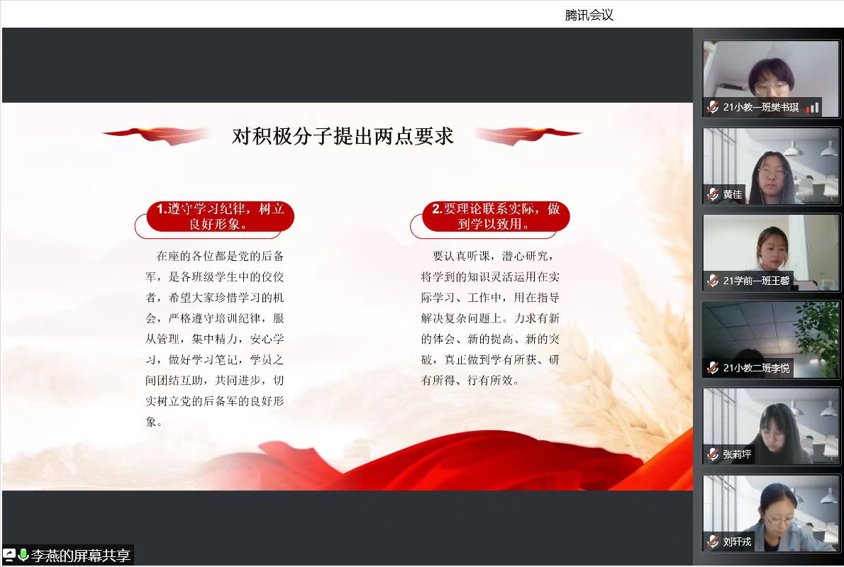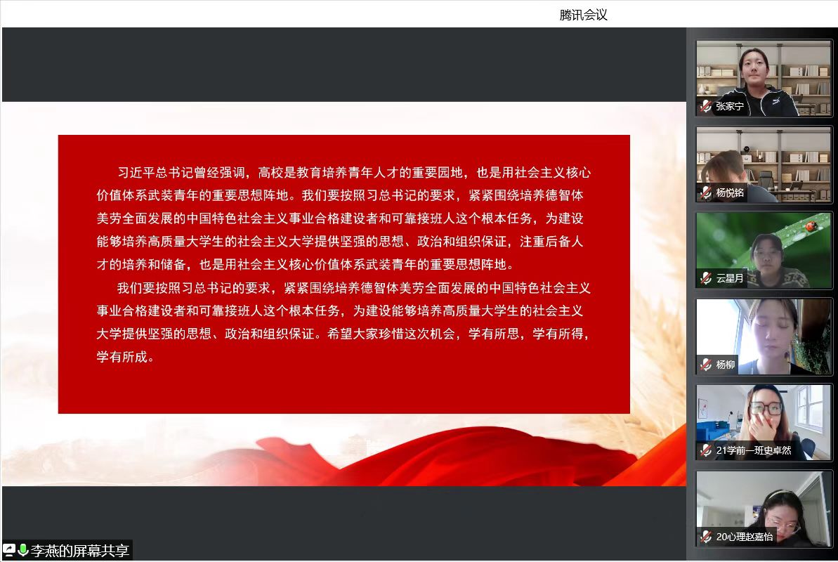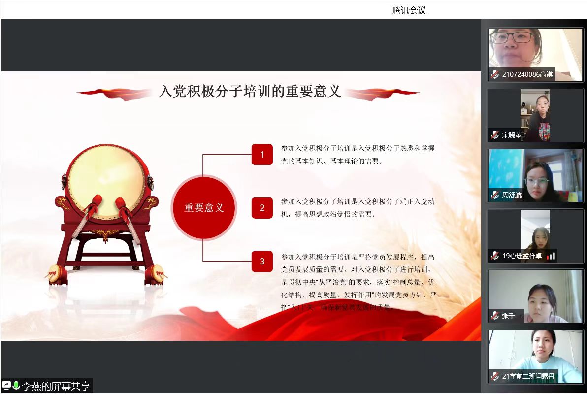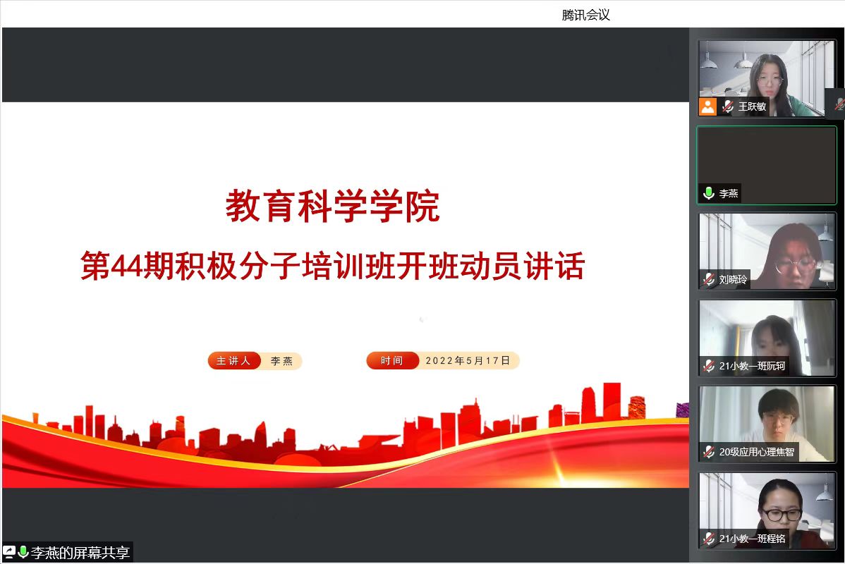 为深入学习贯彻落实习近平新时代中国特色社会主义思想,推动全面从严治党向纵深发展,加强对入党积极分子的培养和教育,帮助大家明确入党目的,端正入党动机,熟悉和掌握党的基本理论知识,不断提高思想政治素质,坚定理想信念,5月17日晚7时,教育科学学院在腾讯会议上举办了第44期入党积极分子培训班开班仪式,87名入党积极分子参加了开班培训。