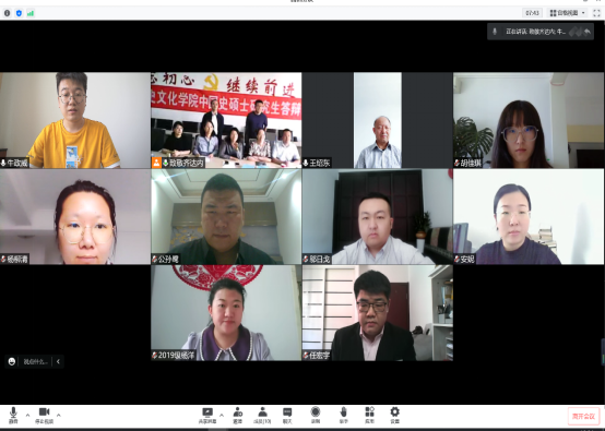 5月20日上午,历史文化学院在学院会议室通过腾讯会议以线上的形式举行了2022届中国史硕士研究生学位论文答辩会。内蒙古大学王绍东教授担任本次答辩委员会主席,答辩委员有历史文化学院刘春玲教授、尚烨教授、张淑利副教授、刘晓堂副教授、代小博士,刘晓东助教担任答辩秘书。历史文化学院全体在读研究生在线参加了答辩会。