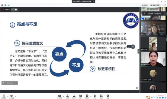 本次答辩秉持公平、公正、公开的原则,严格按照学生自述、评委提问、学生应答、评委评议评分等程序进行。答辩过程中,同学们以PPT的形式围绕论文对选题意义、理论框架、研究内容、研究方法、研究过程、主要创新点和研究结论等方面进行了详细汇报。评委老师们立足论文主体,对质量严格把关,围绕论文的结构框架、文章逻辑,从不同角度切入进行了点评与提问。整个答辩过程规范有序、秩序井然。