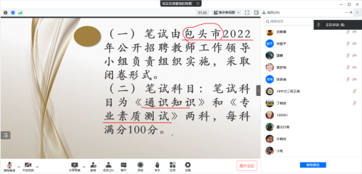 首先,刘旭老师强调了2022年包头市教师招考的笔试科目不同于往年,《通识知识》和《专业素质测试》考生需格外关注。紧接着详细分析了包头市各旗县区近几年教师招考科目,厘清重难点,强调同学们要认真学习中国特色社会主义思想、党史知识和公共基础知识。通过分析经典例题,从例题背后深入挖掘教育学、教学心理学考试重点,总结考试经验,提出复习策略。其次,为同学们分享了党史知识、教师政策法规、教师职业素养等重点学习内容以供同学们复习参考,并对笔试中特别注意的问题进行了相应补充。最后,建议考生在备考过程中要做好复习规划,调整好状态和心态,预祝同学们都能在即将到来的考试中取得佳绩,早日达到理想的彼岸。