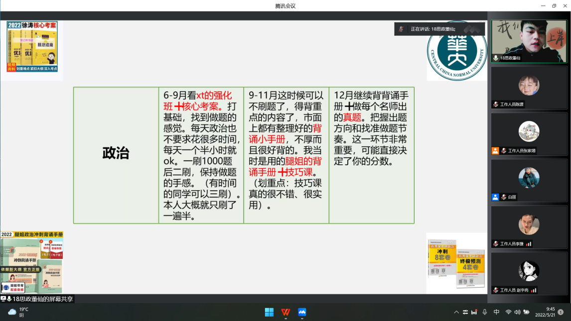 近年来,越来越多的大学生选择了考研这条道路,但是许多准备考研的同学对于考研事项或多或少还有疑惑,如何去面对考研?怎样去准备考研?为了让学生对考研有更充分的认识,明确本专业的就业方向和发展前景,进而更好地了解考研趋势、备考考研,5月20日至5月21日,政治与法律学院举办了两场考研经验交流讲座。此次讲座分别邀请了18级法学、社会工作、政治学与行政学和思想政治教育四个专业成功上岸的14名同学,采取线上直播的方式进行了考研经验交流。讲座由辅导员白丽主持,政法学院全体同学参与。各年级同学报名热情高涨,参与活动积极踊跃,并认真听取考研经验,展现出学院浓厚的学习氛围和学习态度。