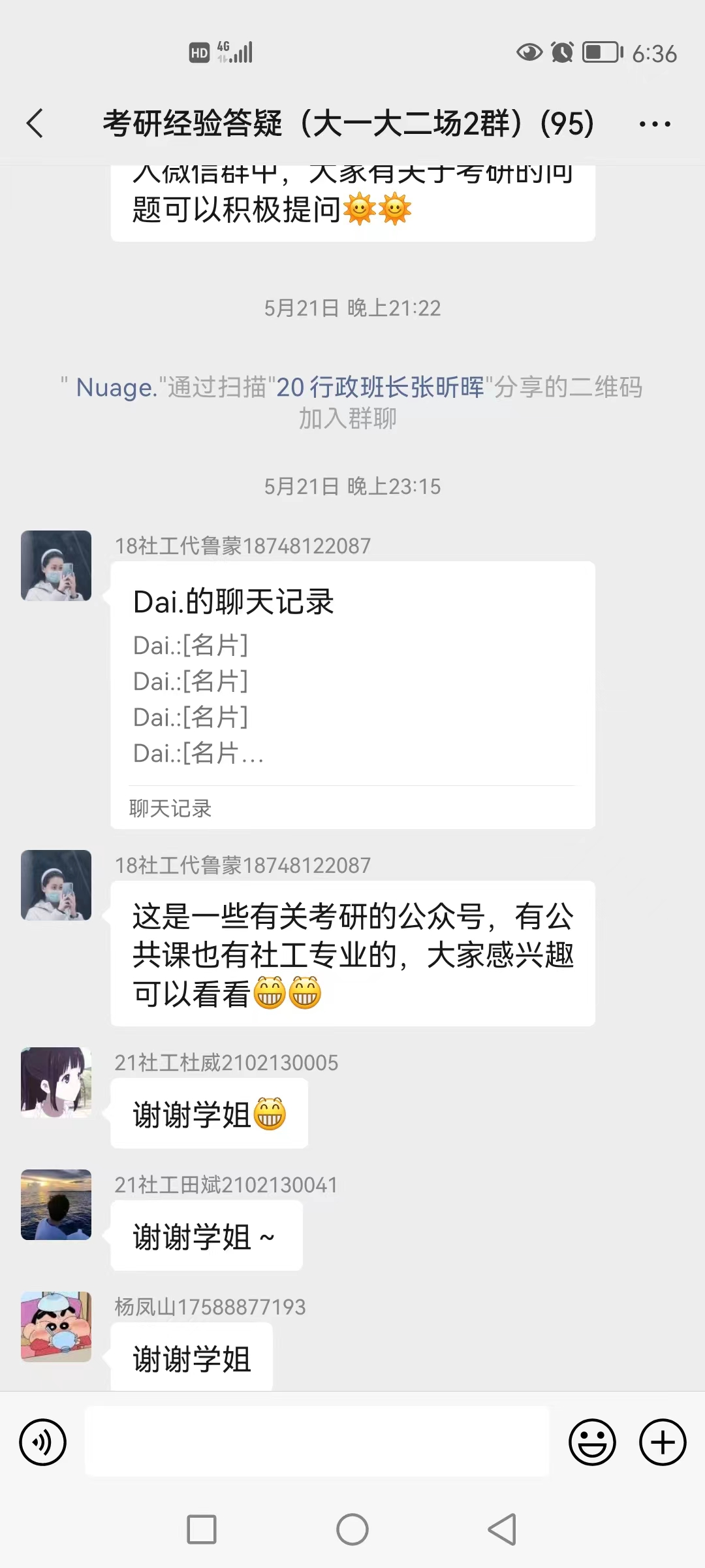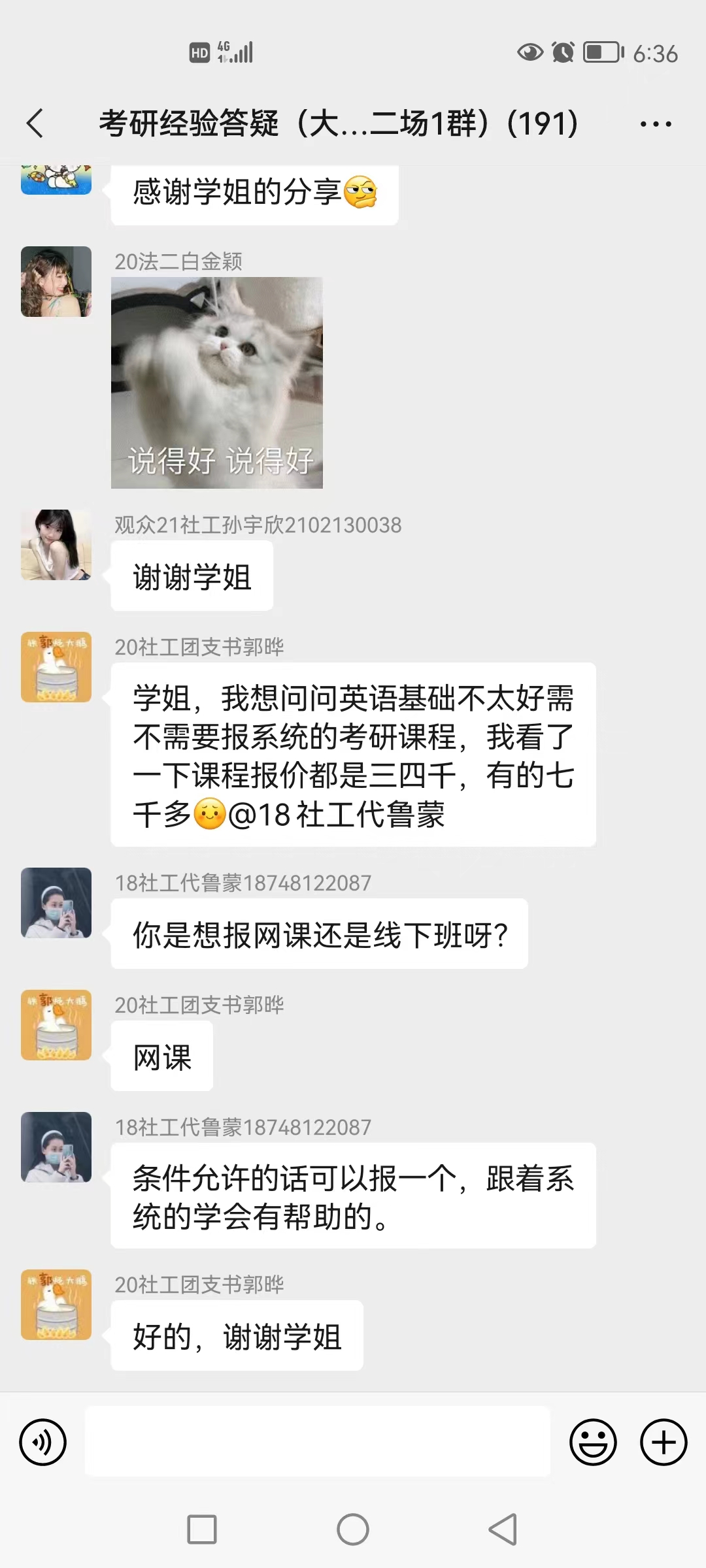 跟以往的考研交流不同的是学院建立了两个考研经验交流微信答疑群,由考研上岸的14名同学入住一周时间,同学们积极提出自己考研路上遇到的不解和困惑,学长学姐根据自己的经验耐心为同学们解惑,进一步加深了同学们对考研的了解,同学们表示受益匪浅。