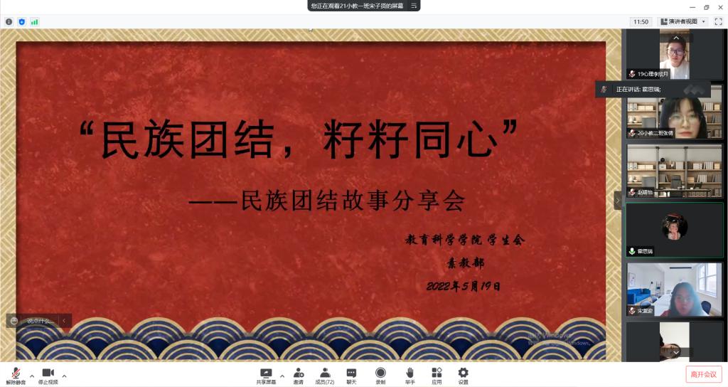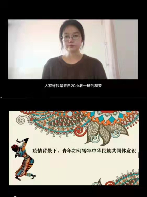 ——故事分享会活动。5月19日,学生会素教部在腾讯会议上举办“民族团结,籽籽同心”民族团结进步故事分享会活动,11位同学参与分享,辅导员王璐然和55名观众在线聆听。同学们分享的故事中,有独自抚养28个孤儿,用一辈子的真情付出诠释了人间大爱的最美“额吉”都贵玛,还有扎根边疆三十余年义务巡边,忠诚守护绿色草原的"草原卫士"阿迪雅。只要有人讲,民族故事就会不断流传,讲述给更多更新的人听。疫情期间,“泰州丝路信使”蒋凯将一箱又一箱从各国募集来的口罩和医用手套通过过关检查由快递输送到湖北疫区;传奇三娘子三嫁三代顺义王,促成蒙汉和平并恢复“贡市”;民族团结进步模范个人孟亚静在促进民族团结,推动猎民经济发展中做出巨大贡献。同学们分享的故事或声泪俱下,撼人心魄;或铿锵有力,催人奋发;或娓娓道来,沁人心脾;或钩沉索引,引人入胜,让在场的每一位同学感受到中华民族一家亲的浓厚氛围。