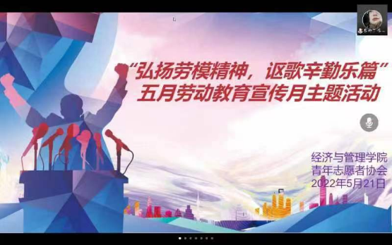 党的十八大以来,习近平总书记多次礼赞劳动创造,讴歌劳模精神、劳动精神、工匠精神,勉励广大劳动者勤于创造、勇于奋斗。为深入学习贯彻落实习近平总书记有关劳动教育的重要论述,引导学生积极践行社会主义核心价值体系,树立正确的劳动观,以劳动教育锻造时代新人。经济与管理学院青年志愿者协会于5月21日线上开展“弘扬劳模精神,讴歌辛勤乐篇”五月劳动教育宣传月主题活动。