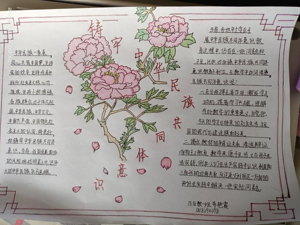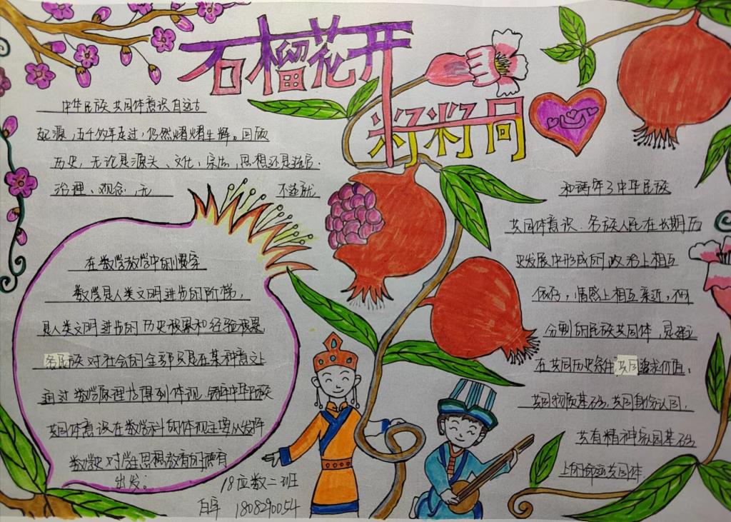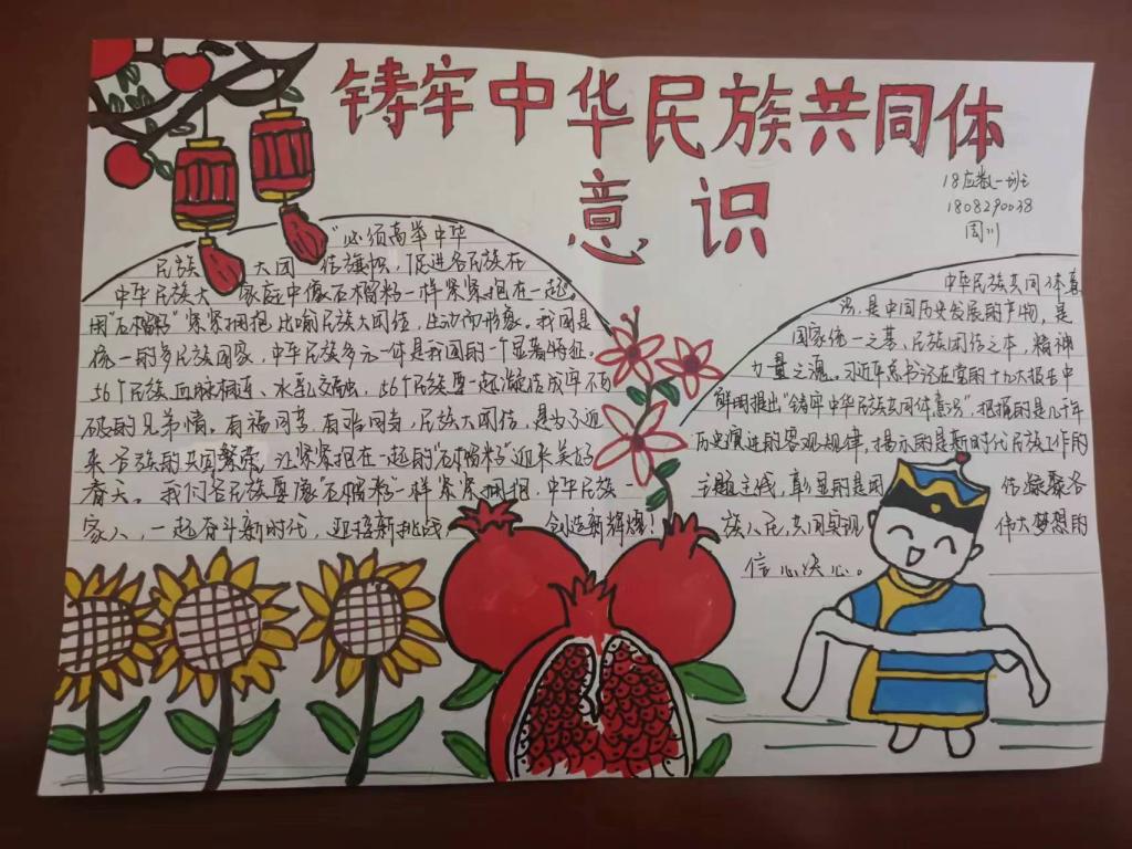 制作“铸牢中华民族共同体意识”主题手抄报:为了加深学生对党的民族政策的理解,数学科学学院组织学生开展“铸牢中华民族共同体意识”主题手抄报制作活动。活动收到207份学生作品,从不同角度反映了学生对自己如何铸牢中华民族共同体意识、如何在新时代党的民族工作中发挥作用、如何铸牢祖国北疆安全稳定屏障的理解。