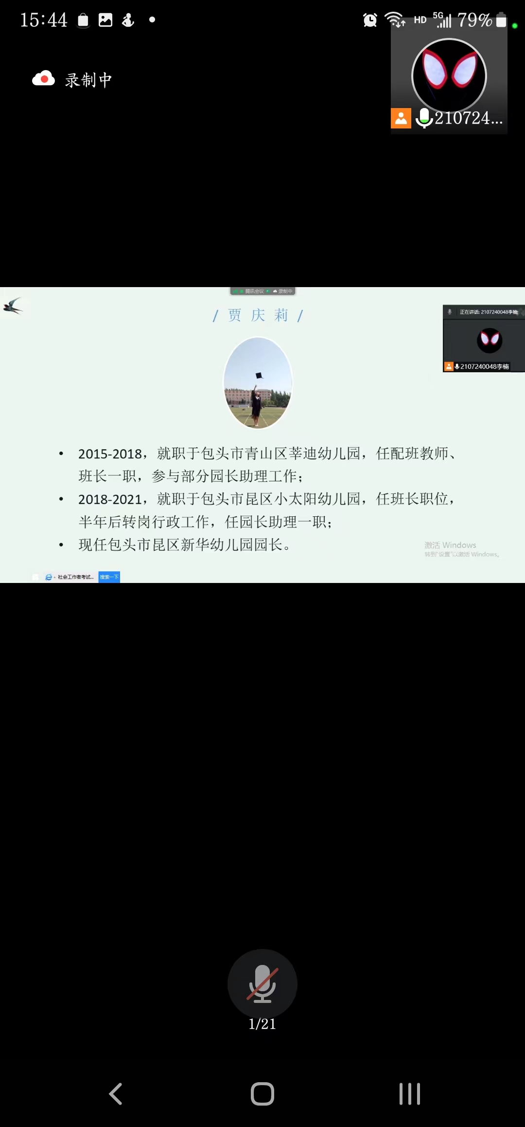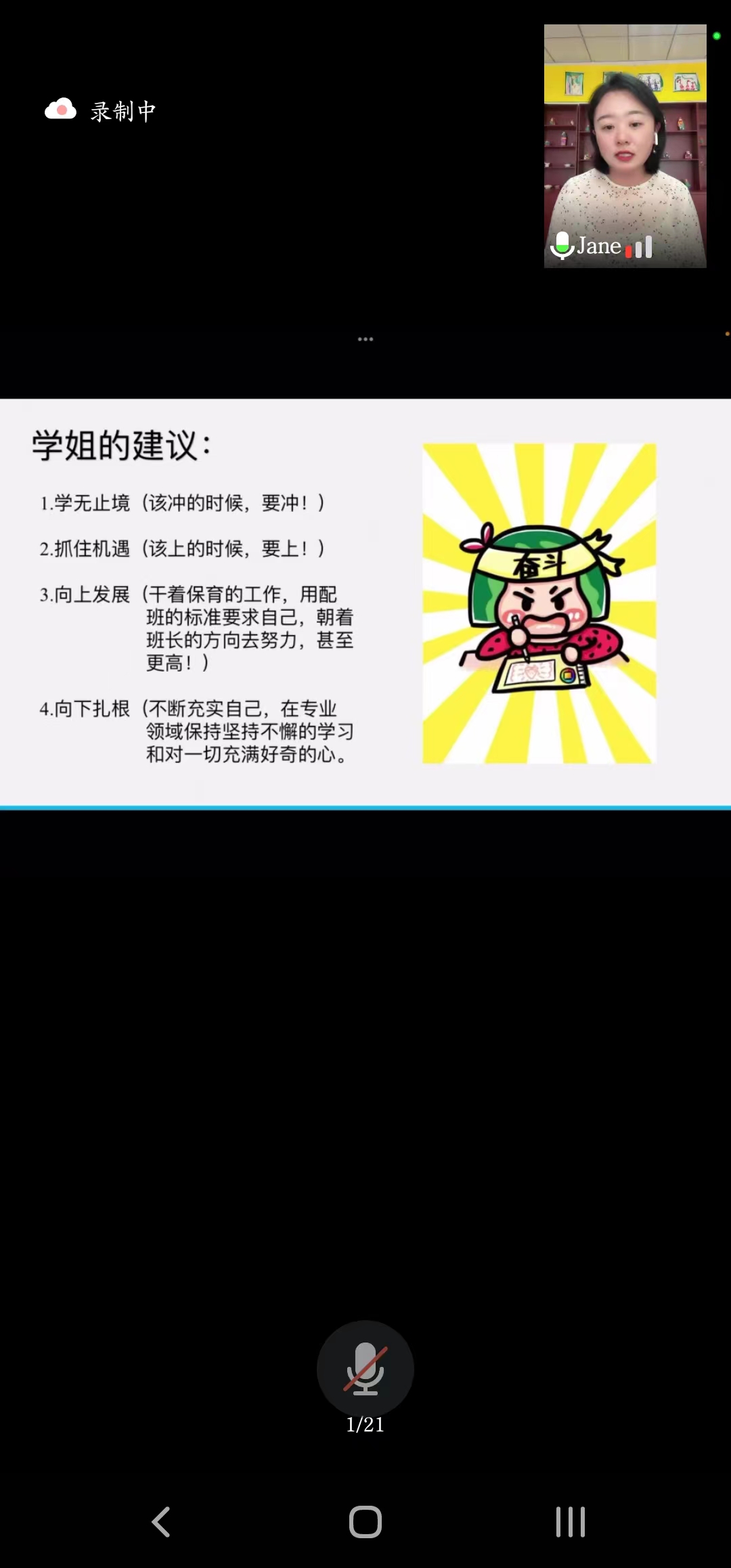 贾庆莉是学院2016届学前教育专业毕业生,现任职包头市昆区新华幼儿园执行园长。贾园长以“心有所信,方能远行”这样一句话展开了分享,在交流过程中,她首先从证书获得以及工作经历两方面介绍了自己,回顾了自己大学四年的学习生涯,分享了从基层做起的工作经历,勉励大家要抓住机遇、积累经验、不怕犯错,以此达到锤炼和提升自己的目的;专业领域要始终保有刻苦努力、认真钻研、持之以恒的奋斗姿态,做到向下扎根,不断充实自己,真正明确和清晰自己以后要怎么走、走什么样的路。接下来她展示了包头市近几年招考信息汇总表以及各地公办幼儿园就业七八年后的薪资待遇和编制落实情况,借此分析了当下毕业生就业情况,同时对教职工队伍工作要求以及资薪待遇作了剖析,详细分析了民办幼儿园的优势。