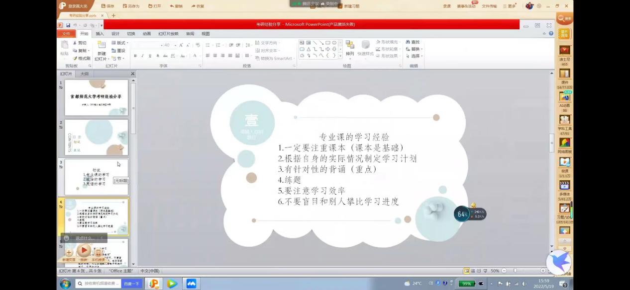 志存高远,方能明前路;取之有道,才可决胜负。随着社会经济发展,就业竞争加剧,使得考研人数日益增多,压力日益加大,为了帮助小学教育专业的同学做好考研规划,解决考研难点痛点,明析考研形势,做好战略战术准备,教育科学学院于2022年5月19日利用腾讯会议线上举办小学教育专业考研经验交流会,2019、2020、2021级小学教育专业160余名学生参加了本次交流会。