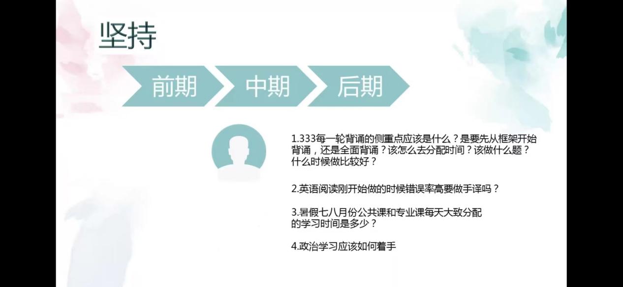 2018级小教一班孙阳(考研分数:372,考研学校、专业:包头师范学院小学教育专业)将考研备考历程分为前期、中期和后期三个阶段。她建议同学们在面对前期学习新知识困难、中期遇到记忆瓶颈和后期自我压力增大时一定要坚定考研意志,将坚持的心态贯穿始终。