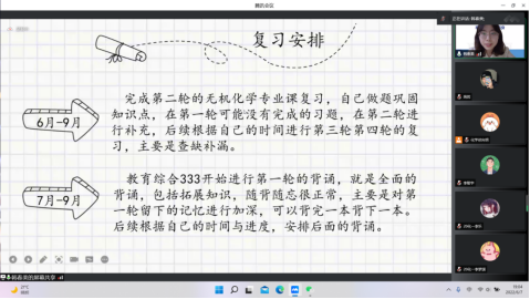 为全面提升我院学生考研质量,切实发挥帮扶指导作用,6月7日晚,化学学院利用腾讯会议组织了考研汇报交流会。会议特别邀请了马克思主义学院张雪瑞老师和我院4名考研学生代表,分别就公共科目备考要点、目标学校专业选择、备考心理自我调适及考前冲刺重点工作等方面进行了指导和经验分享。近百名低年级同学线上参会,会议由院学工办辅导员徐向明老师主持。