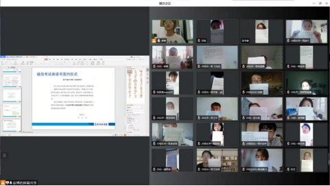 随后,会议组织全体学生进行了诚信考试承诺书线上签约仪式,同学们开启摄像头、在考试诚信承诺书上郑重签名并一一展示。
