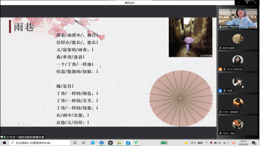 本次比赛分为初赛、决赛两个阶段,参赛选手从中小学语文教材中选取诗词经典篇目,进行诵读演绎和深度讲解。初赛于6月2日举办,文学院党总支副书记孙傲飚、学工办负责人贺芬、辅导员白斯琴担任评委,共16名同学参加,最后8位参赛者脱颖而出。决赛于6月9日举办,汉语言文学专任教师赵建军、陈海波、武慧敏担任评委,参赛者们精心选择了中小学语文教材中的诗词经典篇目,包括陶渊明的《饮酒》、苏轼的《念奴娇·赤壁怀古》、戴望舒的《雨巷》、陆游的《十一月四日风雨大作》、李煜的《相见欢》、杜甫的《登岳阳楼记》等,或体现铮铮铁骨、或体现高洁情怀、或警示后人思考、或引发大家共鸣,诗歌与微课的结合形式更是增添了同学们对于诗词的热情。