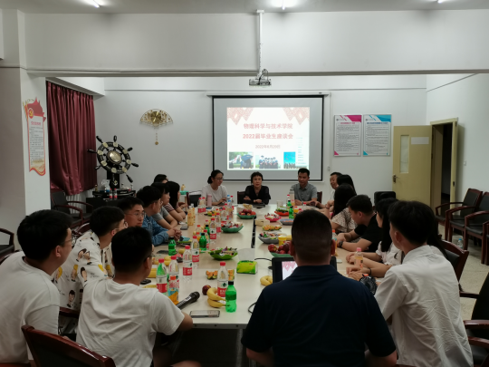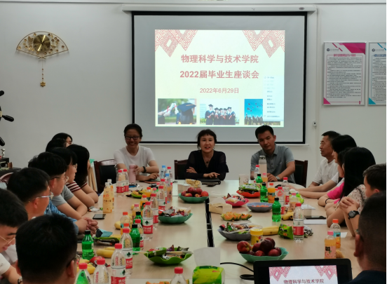 为进一步做好2022届毕业生离校关怀服务工作,充分了解毕业生的学习、生活、就业情况。6月29日,物理科学与技术学院举办2022届毕业生座谈会。参与座谈的有学院党总支书记李慧龙、副书记郭凯敏、副院长王芳、许国顺等住校教师、班主任、辅导员及各专业毕业生代表。