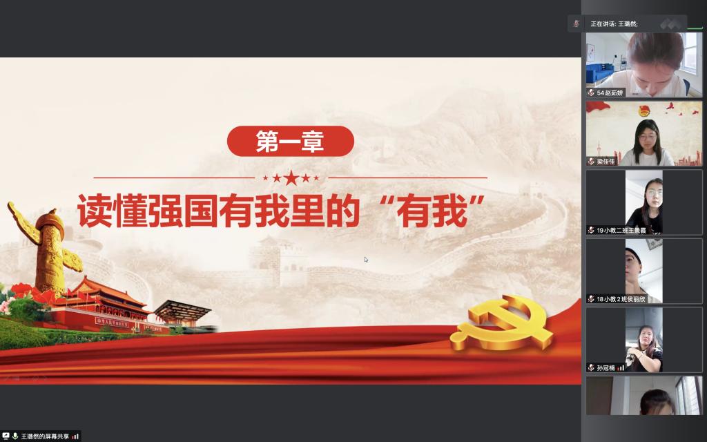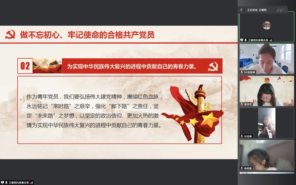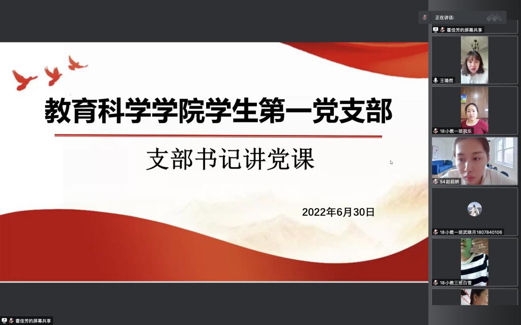 为不断提高学生党员思想水平和政治觉悟,更好地践行党的宗旨,激励广大学生党员不忘初心赓续奋斗,创造更辉煌的业绩,6月30日晚7点,教育科学学院学生第一党支部在腾讯会议上举办了“庆七一·支部书记讲党课”活动,党支部书记王璐然以“请党放心,强国有我”为主题,为51名党员上了一堂生动的党课。