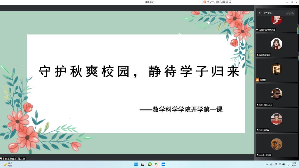 根据学校疫情防控工作要求,为进一步做好高校思想政治教育、爱国主义教育、疫情防控教育和安全教育,8月22日数学科学学院以班级为单位组织召开以“喜迎二十大,拥抱新学期”为主题的线上“开学第一课”。
