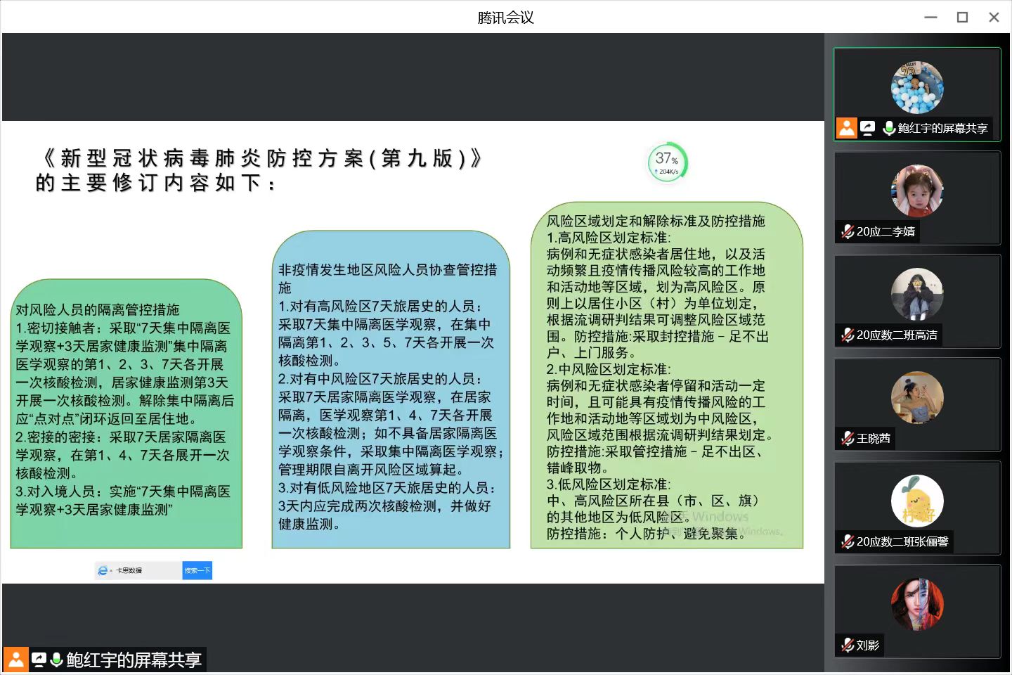 各班结合实际情况,重点开展了学习《新型冠状病毒肺炎防控方案(第九版)》,自治区、包头市疫情防控政策、校园安全防护等疫情防控教育;疫情防控下的心理调节、如何建立和谐的人际关系等心理健康教育;普及安全知识,高度警惕校园贷、消费贷,防范电信诈骗等安全教育。最后从“勤奋学习,争做优秀数学人”角度出发,开展新学期学风教育,引导同学们制定新规划、树立新目标。