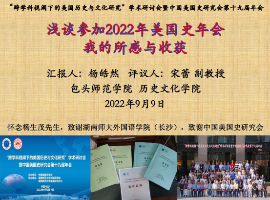 9月3--4日,历史文化学院19级历史班杨皓然同学、21级历史班高蕾同学线上参加“跨学科视阈下的美国历史与文化研究”学术研讨会暨中国美国史研究会第十九届年会。本次年会由中国美国史研究会主办,湖南师范大学外国语学院、湖南师范大学美国研究中心承办,线上线下共计200余位美国史专家学者参加会议。由于疫情原因,两位同学虽未能前往湖南师范大学参加线下会议,但通过线上的方式进行参会。