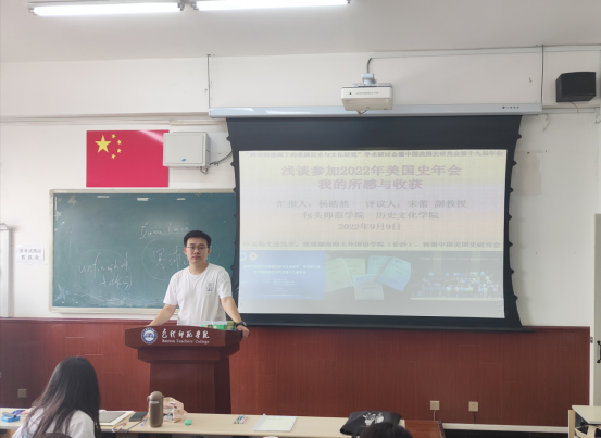 9月9日,杨皓然同学就参加美国史年会感受作了分享,历史文化学院宋蕾副教授出席分享会。杨皓然同学针对年会上的所感与收获,向各位同学做出汇报,指出美洲的古代历史与近现代历史的发展是不可分割的,要联系起来研究和学习。要善于发现问题和解决问题,从美国的发展中思考当今的国家发展与变化,进而对构建人类命运共同体起到重要作用。宋蕾老师结合美国史的研究状况以及世界史学科发展做出评议,紧扣年会跨学科视角研究美国史的主题,并鼓励新生可以多多参加诸如此类的学术活动,在学术活动中不断提升自己,进而使自己获得进步。(历史文化学院)