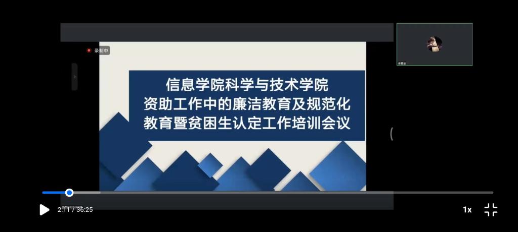 为提高资助工作中廉政意识,加强廉洁教育及规范化教育,加深对贫困生认定工作的学习和掌握,提升资助育人质量,9月5日,信息学院召开了2022年度资助工作廉洁教育及规范化教育暨贫困生认定工作培训会,学院全体辅导员、班主任老师参加了培训,会议由学工办负责人姜嘉丽老师主持。