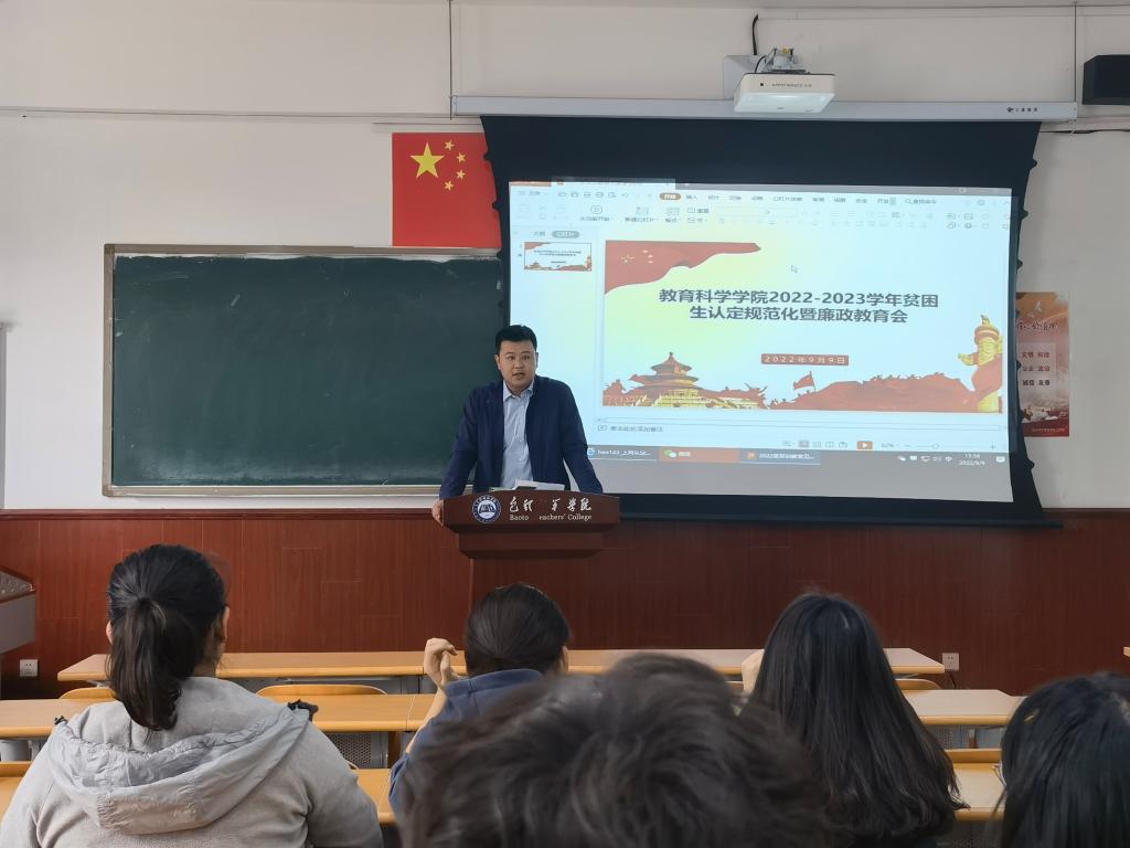 为深入贯彻习近平总书记关于青年工作的重要思想,不断强化学生组织的作风建设,进一步推动学院学生组织的规范化、科学化发展,教育科学学院于9月9日下午4:00在博东103召开2022-2023学年贫困生认定规范化暨廉政教育会,会议由辅导员海林老师主持,各班班长、团支书和学生会干部共计42名学生参加。