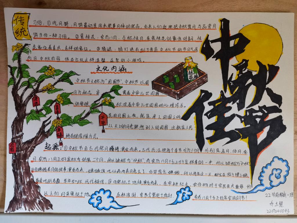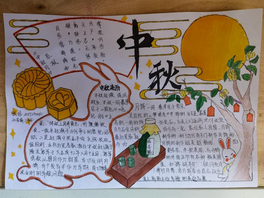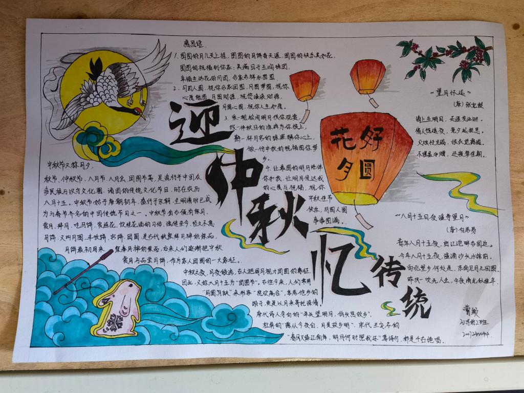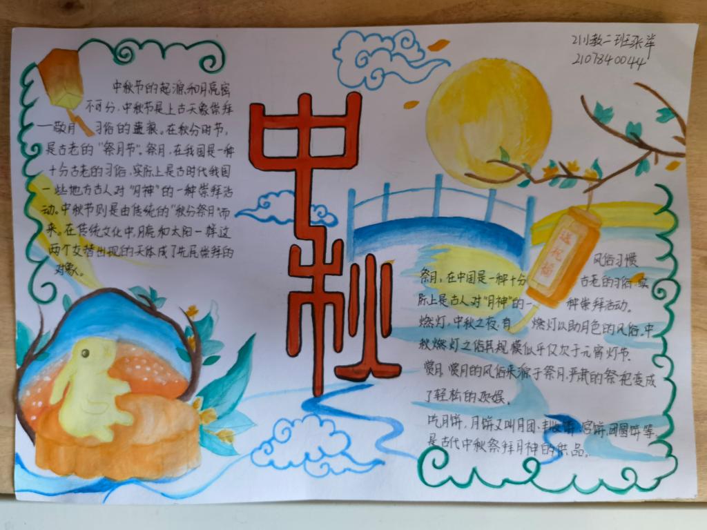 同学们用心搜集资料、自主设计版面,收到作品90余份。尽情挥洒着真情的色彩,丰盈灵动的文字让人回味无穷,表达了学子们节日将至的喜悦心情,渗透着对节日庆祝的期待与激动。整个手抄报展览布局合理、色彩鲜明、内容丰富,构思新颖,画面美观,书写规范,展现了同学们积极向上的精神风貌,表达了对祖国的热爱和对亲人的思念,诠释了中秋节的由来、风俗习惯、中秋最美诗词等传统文化,活动营造出了浓郁的校园文化氛围。