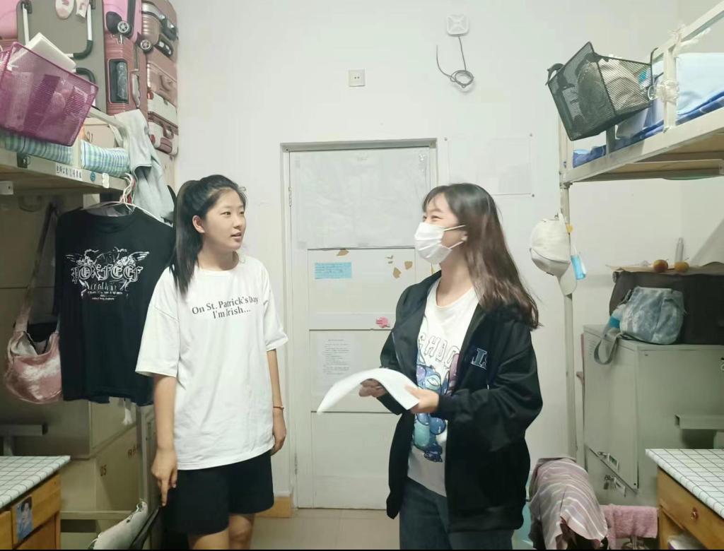 走访中,学生党员们询问同学们的心理状况,对于学生的困惑和疑问,给予细致的解答。