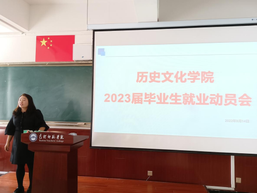2023年校园招聘已拉开帷幕,为增强毕业生对就业形势的了解,端正学生择业观念,提高学生就业能力促进学院毕业生积极就业,提高就业质量,9月14日下午3:30分,历史文化学院在博学楼博东400教室召开2023届毕业生就业动员大会。学院党总支副书记吴冰、辅导员张英及2019级全体同学参会。会议由辅导员包艳萍主持。