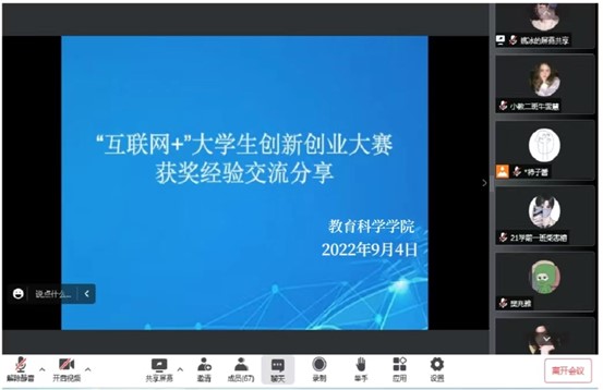 创业是时代的主旋律,大学生是创业的主力军。为贯彻国家“大众创业、万众创新”理念,进一步激发大学生创新创业热情,提高师生创新创业能力,教育科学学院学生会教师职业技能发展部于9月4日下午15点30分举办了“互联网+”大学生创新创业大赛经验交流分享线上会议。
