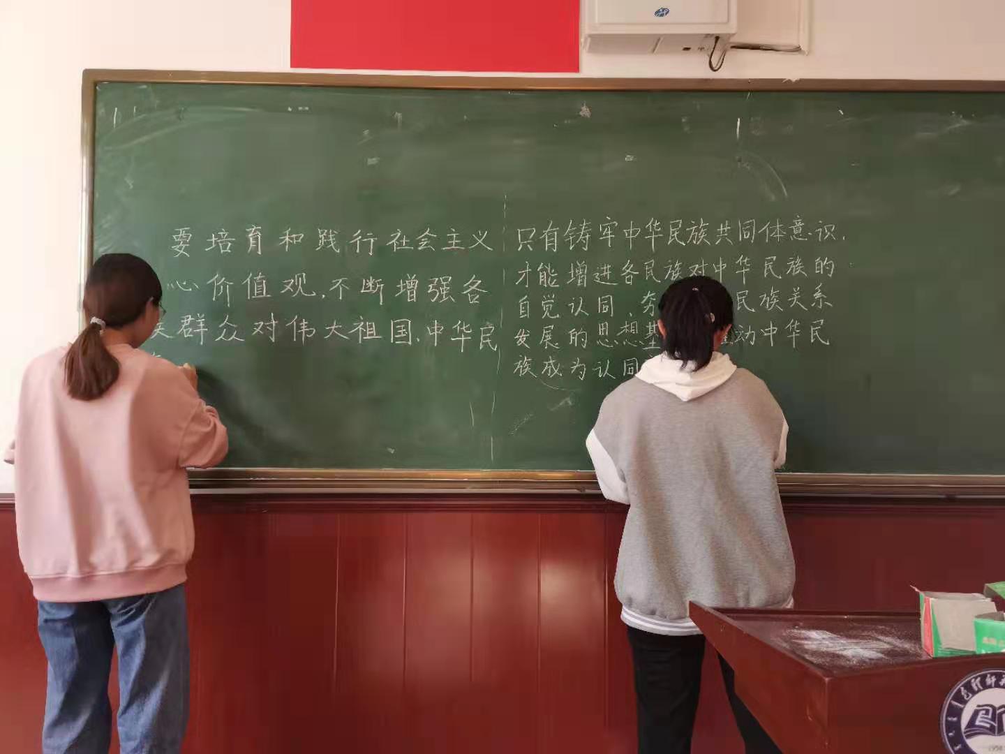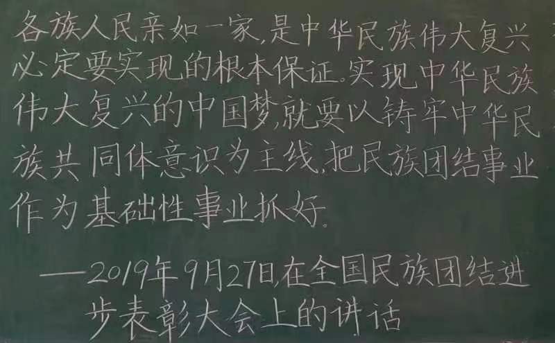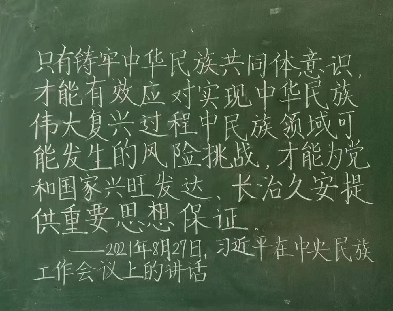 9月17日-9月18日,教育科学学院团总支举办“喜迎二十大、永远跟党走、奋进新征程——中国梦·民族情”粉笔字作品征集活动。活动主要围绕民族团结、铸牢中华民族共同体意识为主题,以粉笔字的形式开展,共征集到28份作品。同学们的作品中有的提按分明,有的刚劲有力,有的潇洒飘逸,有的大方得体,有的秀气隽美,无不透着或规范、或严谨、或灵动的气质。