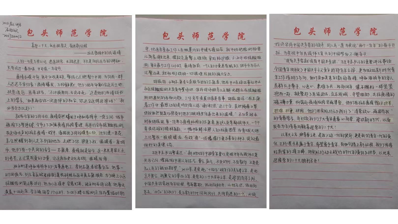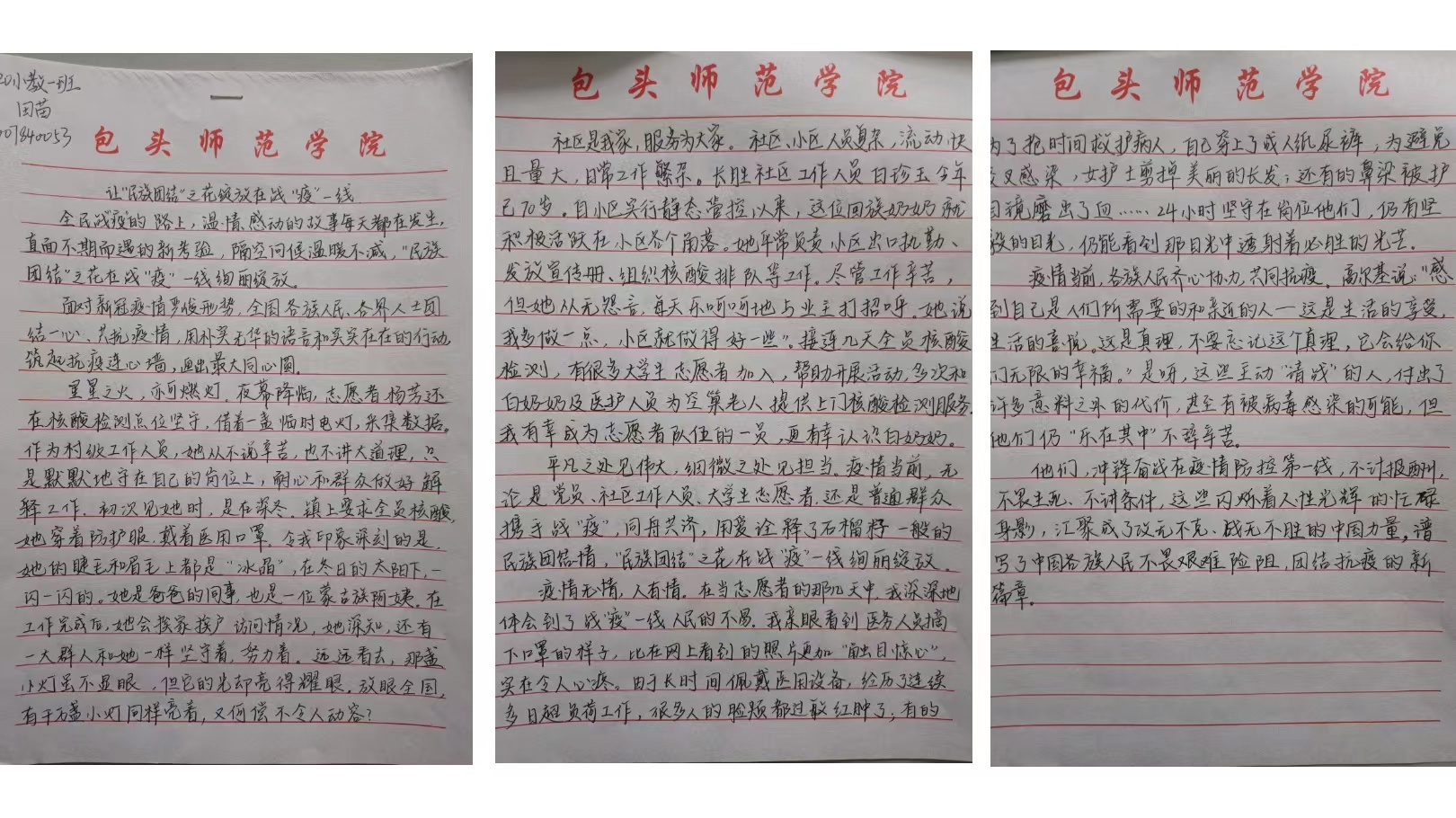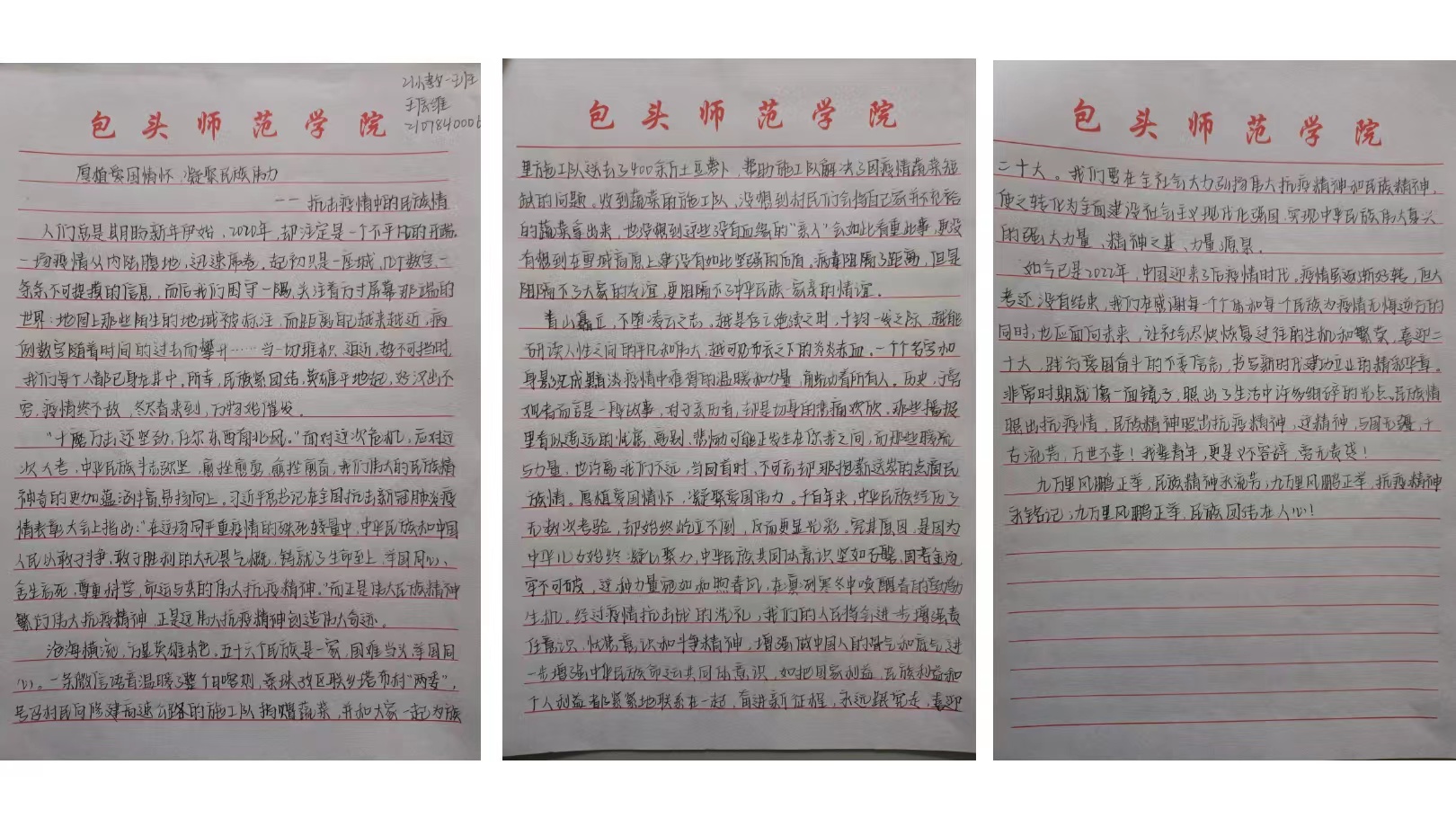 撰写一份心得。9月15日—9月17日,学生会素教部开展“喜迎二十大、永远跟党走、奋进新征程——抗击疫情中的民族情”主题征文活动。全院学生热情参与,踊跃投稿,共收到200余篇稿件。同学们情真意切,笔酣墨饱,有的同学写到党员在抗疫中应当以身作则、起模范表率作用的,也有讲述学生个人主动参与到社区抗疫志愿服务的,还有讲述西藏支援武汉的感人事迹的,更有的同学写到“疫情当前,各民族人民主动担当,携手战“疫”,用爱演绎了“石榴籽”⼀般的团结精神,为坚决打赢这场战争贡献了力量。”同学们从不同的切入点将个人在疫情防控中所见所闻所感记录下来,充分表达了对各行各业携手抗疫的一线工作人员的赞美之情。