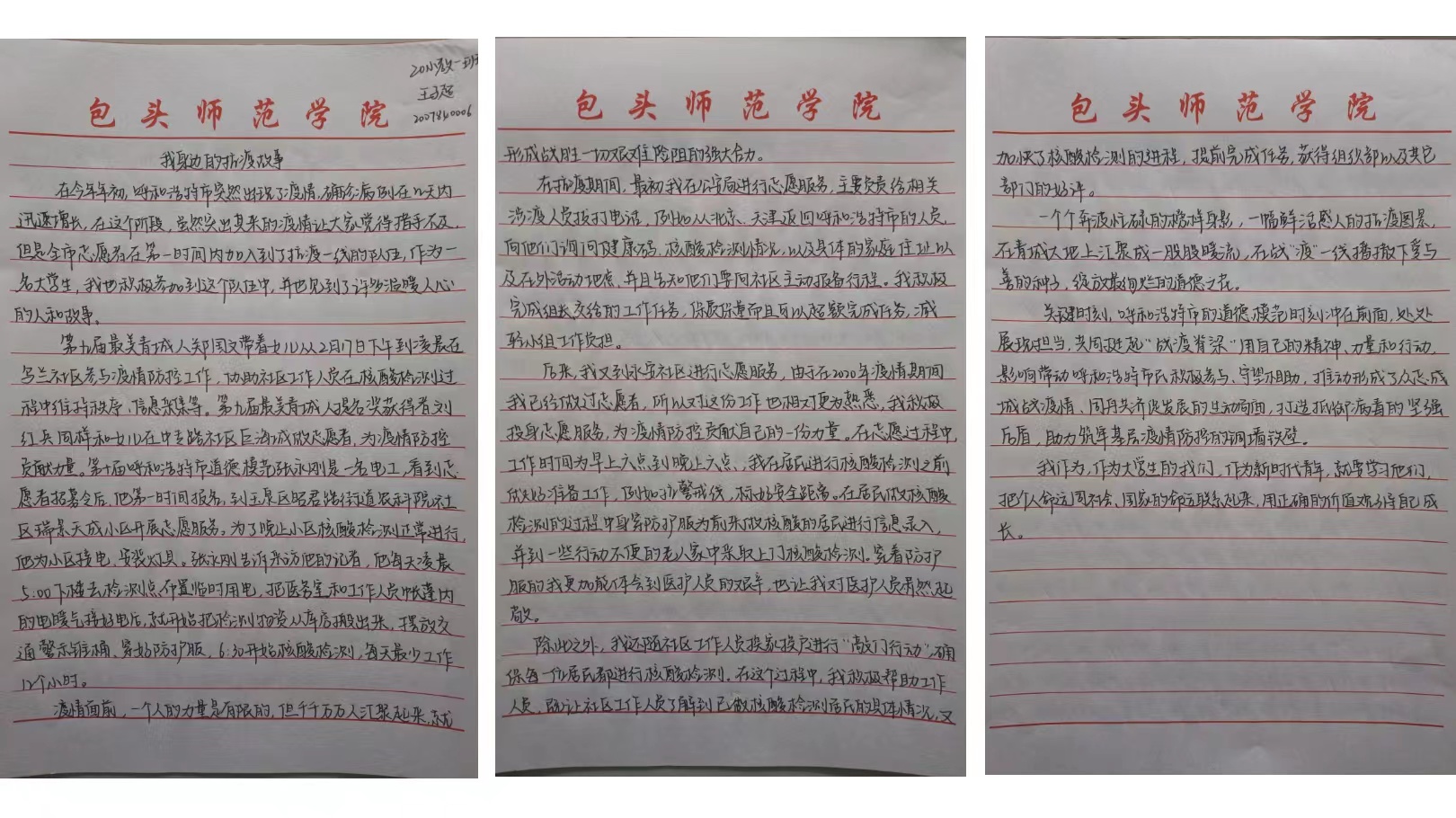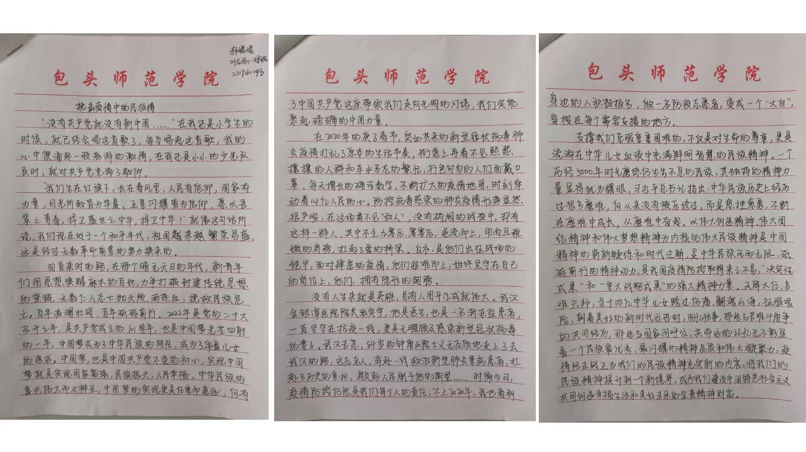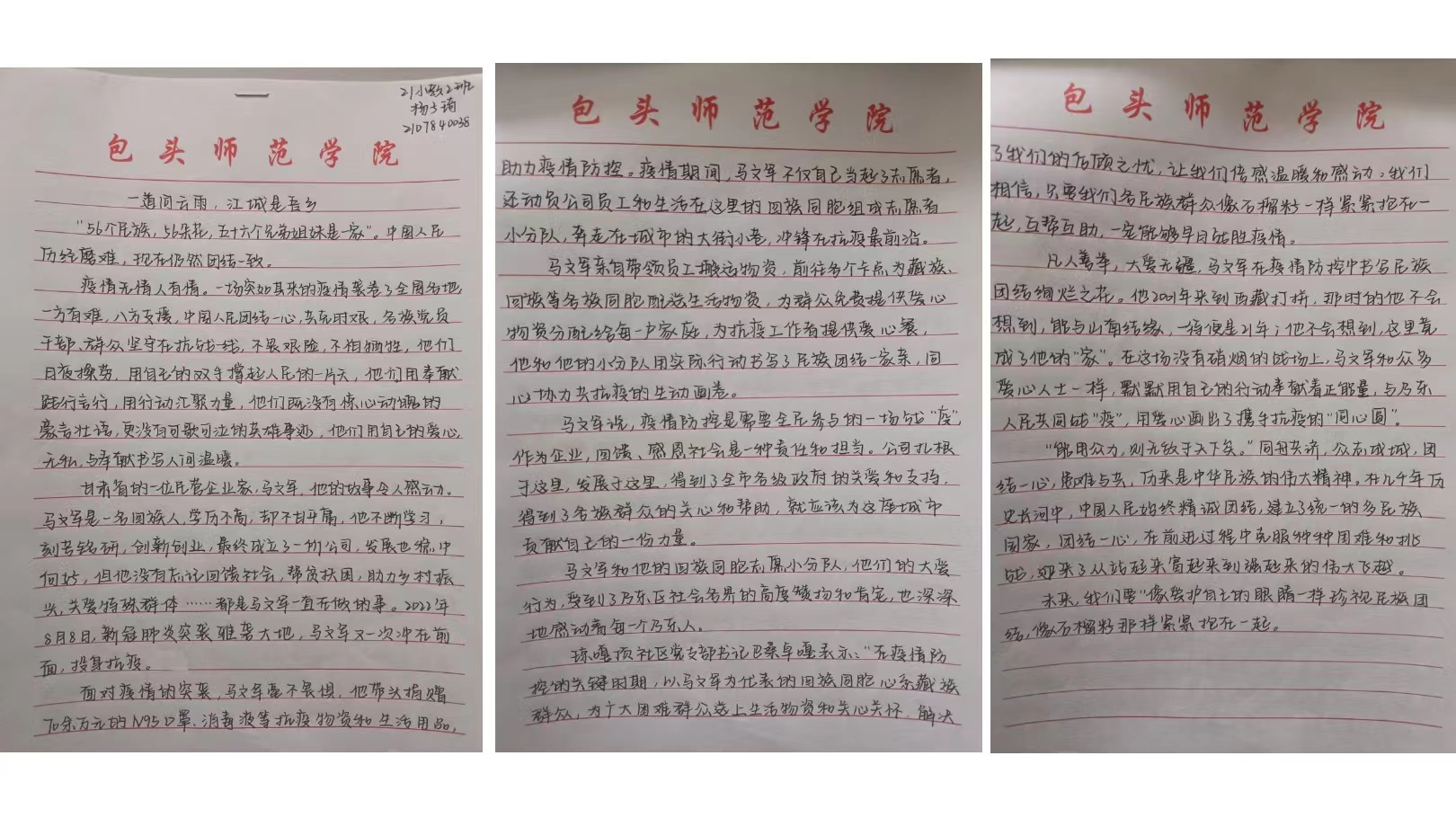 撰写一份心得。9月15日—9月17日,学生会素教部开展“喜迎二十大、永远跟党走、奋进新征程——抗击疫情中的民族情”主题征文活动。全院学生热情参与,踊跃投稿,共收到200余篇稿件。同学们情真意切,笔酣墨饱,有的同学写到党员在抗疫中应当以身作则、起模范表率作用的,也有讲述学生个人主动参与到社区抗疫志愿服务的,还有讲述西藏支援武汉的感人事迹的,更有的同学写到“疫情当前,各民族人民主动担当,携手战“疫”,用爱演绎了“石榴籽”⼀般的团结精神,为坚决打赢这场战争贡献了力量。”同学们从不同的切入点将个人在疫情防控中所见所闻所感记录下来,充分表达了对各行各业携手抗疫的一线工作人员的赞美之情。