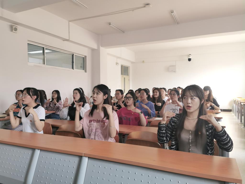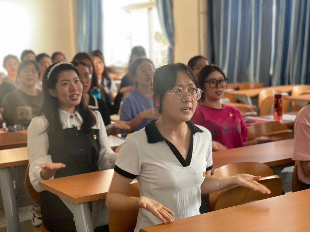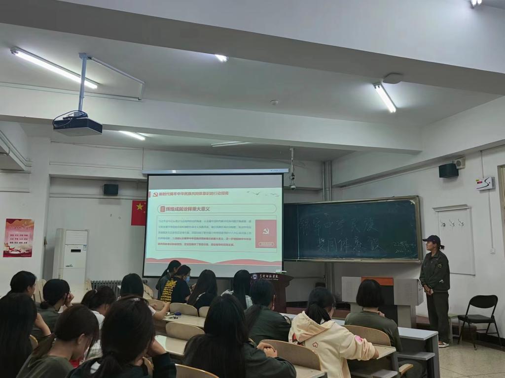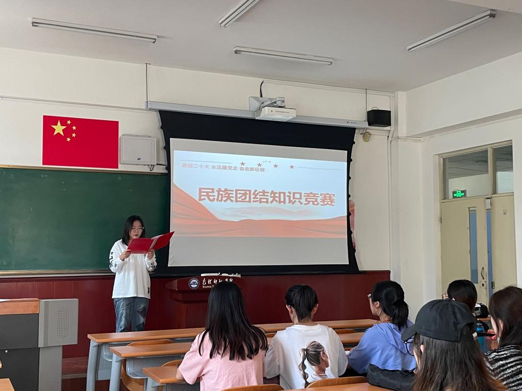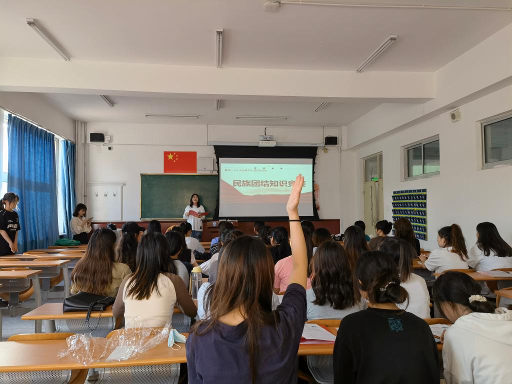 学唱一首歌曲。9月15日,学生党支部在博西102组织开展了“紧紧石榴籽,浓浓中国情”主题党日活动,学生第一支部书记王璐然现场指导,两个党支部41名学生党员参加。全体党员集体学唱《美丽中国》,并录制手势舞。同学们手势整齐划一,气氛欢快热烈,热情激昂的歌声,唱出了对祖国的热爱和身为中华儿女的自豪感。随后,支部开展了民族团结知识问答,通过提问互动的形式,广泛宣传了党的民族宗教理论方针政策,教育引导学生树立自觉维护民族团结的意识,增强中华民族自豪感、自信心和凝聚力。