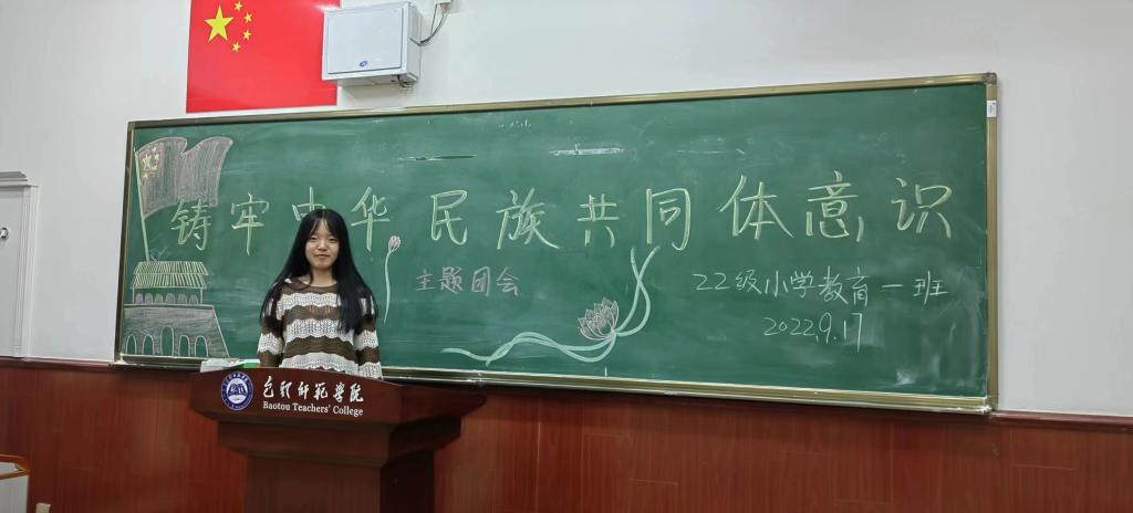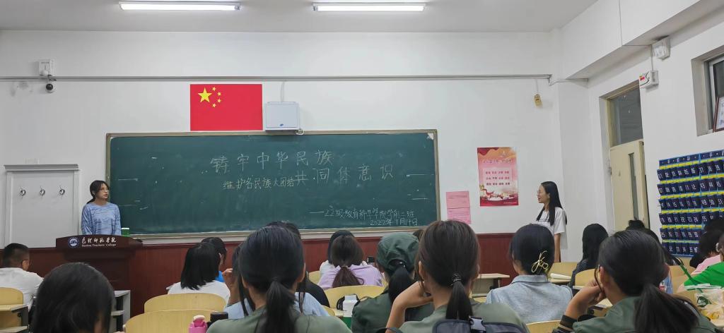 召开一次主题班会。9月10日至9月18日,教育科学学院2022级5个新生班分别开展了以“铸牢中华民族共同体意识”为主题的班会。各班精心组织,全员参与,班会内容选择学生喜爱、接受度高的形式,包括讲故事、观看纪录片、研讨等,把教育化作朋辈间的交流,极大激发了学生的参与度和关注度。