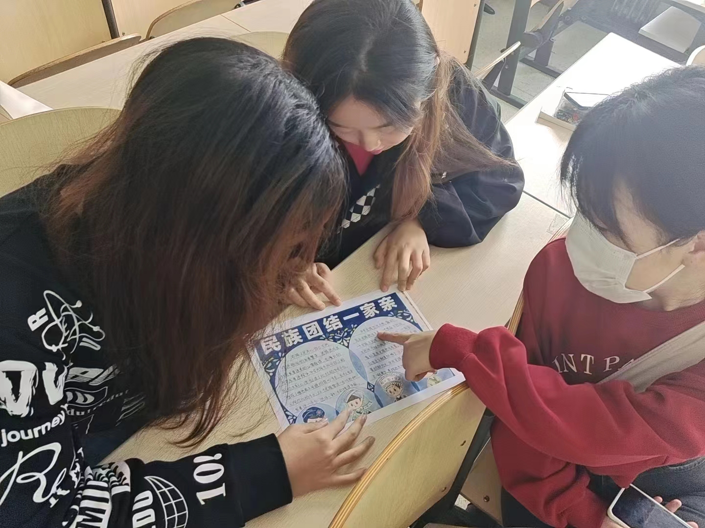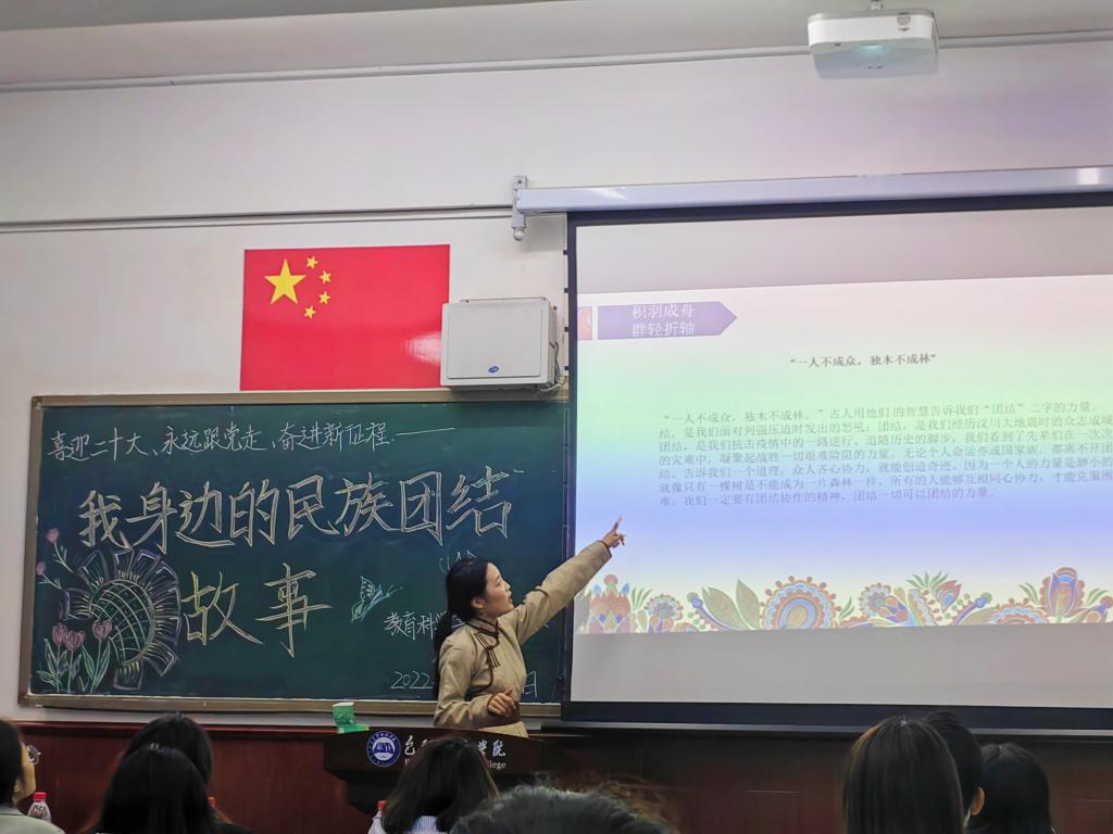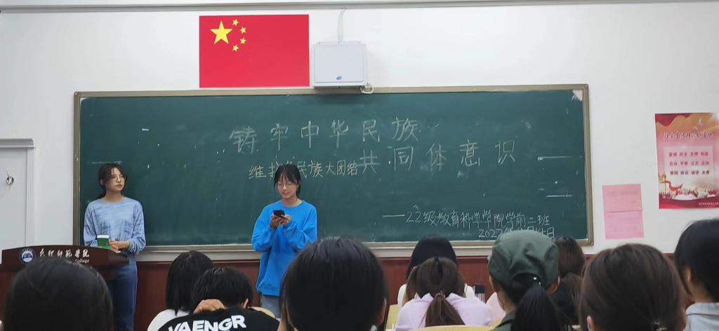 我院结合学院实际情况切实把民族团结进步教育月系列活动与学生专业素质培养和校园文化活动结合起来,把维护民族团结的思想渗透到每位学生心中,在大学生中形成自觉维护民族团结的浓厚氛围,主动融合民族文化,做到团结互助,锤炼本领,勇于担当,肩负起实现中华民族伟大复兴的重任,以民族团结的良好氛围共同迎接党的二十大胜利召开。(教育科学学院)