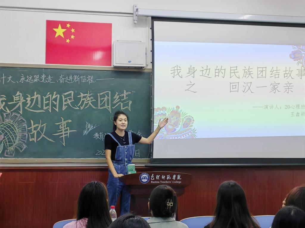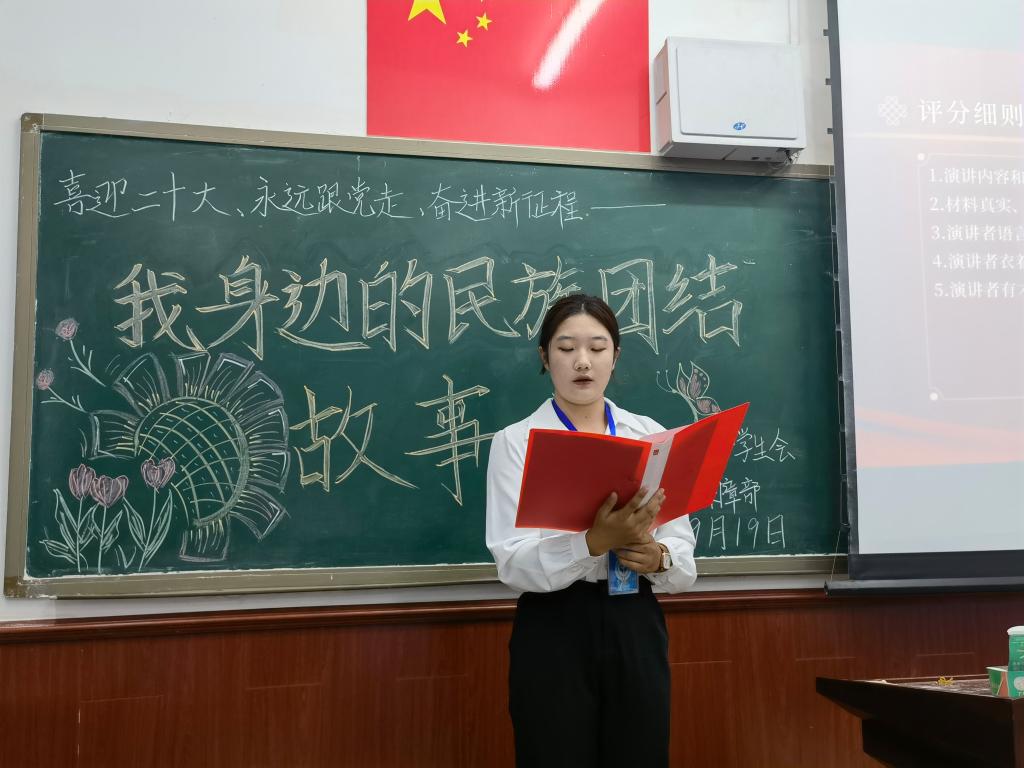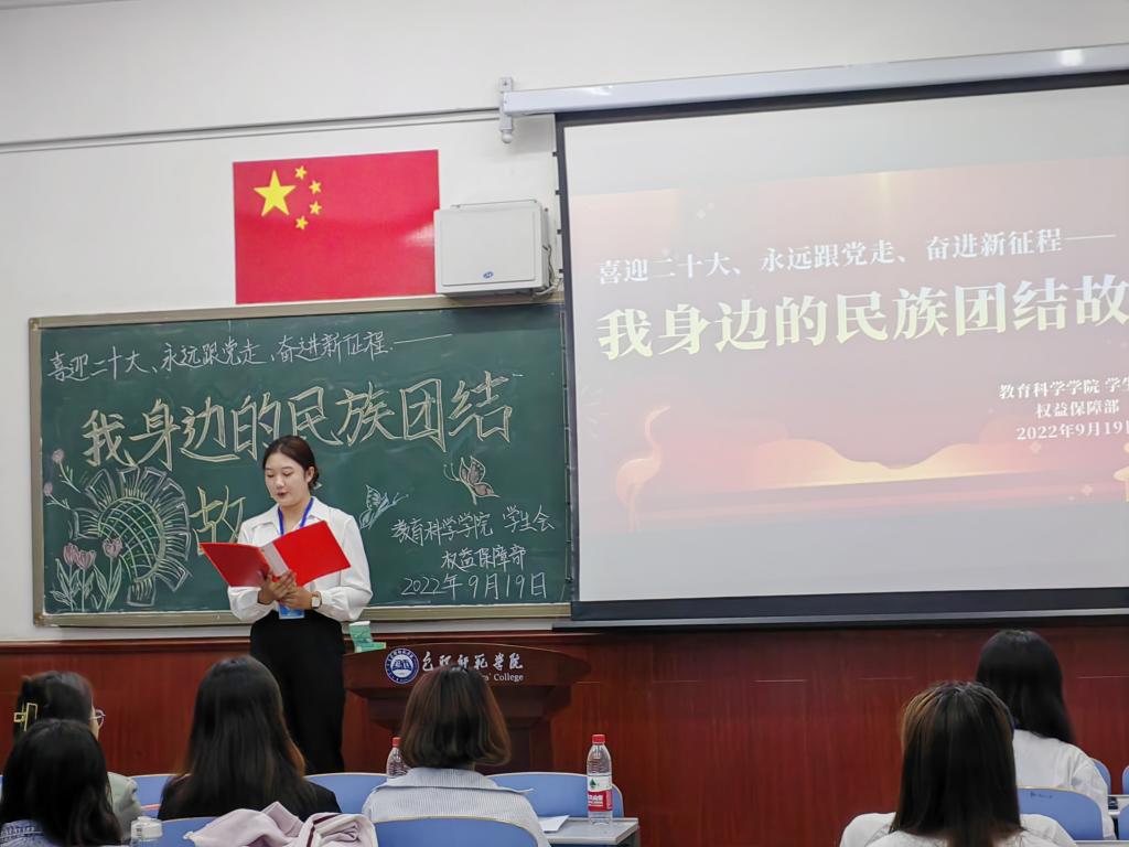 讲述一个故事。9月19日,学生会权益保障部在博西203举办“喜迎二十大、永远跟党走、奋进新征程——我身边的民族团结故事”演讲比赛活动。活动有15名学生参与,4名学生干部担任评委。同学们用生动的语言、真挚的情感、多方面的展示,围绕身边人、身边事以及英雄榜样,从不同角度讴歌了维护民族团结、珍视民族团结的感人故事,活动现场气氛热烈,精彩的表现充分展现出教科院学子昂扬向上的精神风貌。