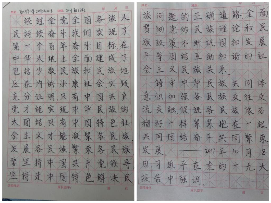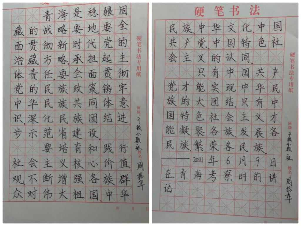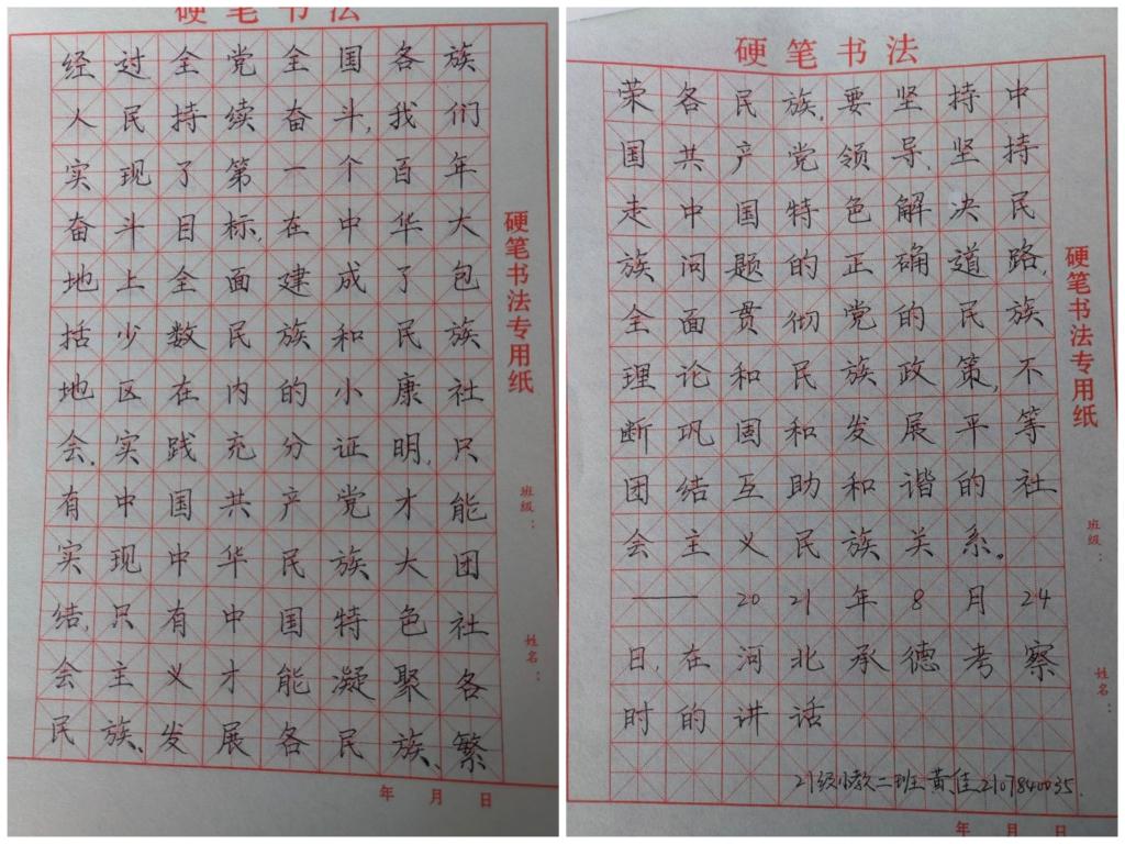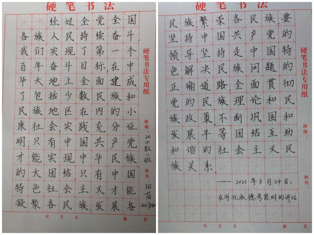 书写一份作品。9月16日-9月18日,院学生会广宣部举办“喜迎二十大、永远跟党走、奋进新征程——石榴结籽心连心,民族团结一家亲”硬笔书法征集活动。活动以书写硬笔书法书写习近平总书记关于民族工作的重要讲话为主,共收到150余份作品。行云流水、笔酣墨饱的字体,或大气、或清秀、或刚健,彰显着秀敏灵动的风格,给人以美的享受。笔尖流淌、笔锋运转,小小的方格之间书写着各族人民的生命线——民族团结。
