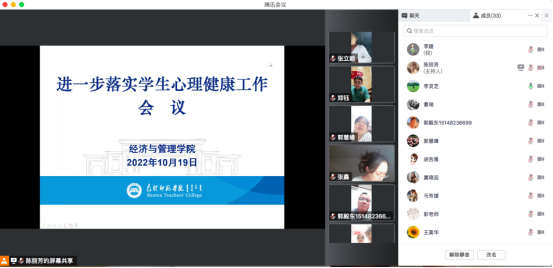 为进一步做好校园封控期间学生心理健康教育,10月19日晚,经济与管理学院召开专项工作会议,对学生心理健康工作再安排再部署。班子全体成员与全体辅导员、班主任老师共同商讨深入做好学院学生的身心健康工作。会议由院党总支书记李灵芝主持,副书记赵洪宝、副院长李建忠及全体班主任、辅导员、院办工作人员参加会议。